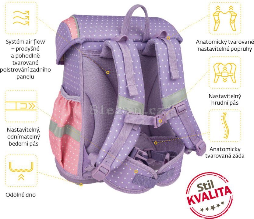 - POHODLÍ – výškově nastavitelný hrudní a nově i odnímatelný bederní pás s kvalitní přezkou zajistí pohodlné usazení aktovky na zádech dítěte i správné rozložení váhy