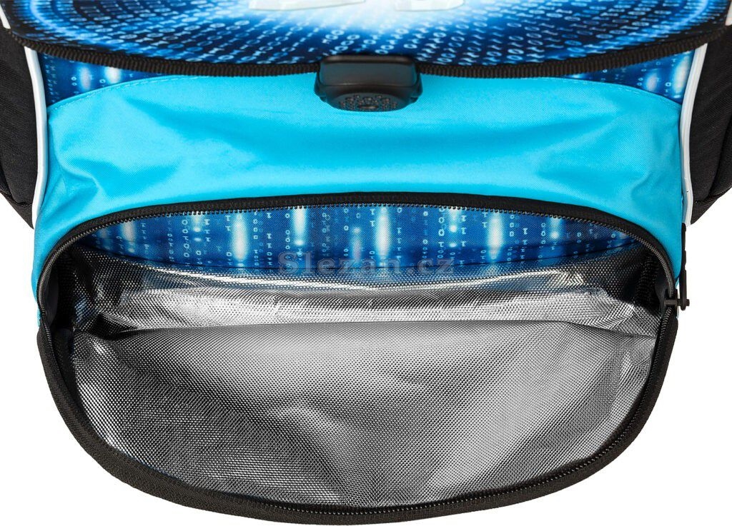 - VNITŘNÍ USPOŘÁDÁNÍ - hlavní vnitřní komora je rozdělená látkovou přepážkou pro lepší uložení pomůcek. V přední části komory je kapsička pro uložení drobností. Přední kapsa aktovky je určena pro svačinový box a je částečně termoizolační. Udrží vaše jídlo studené nebo teplé.