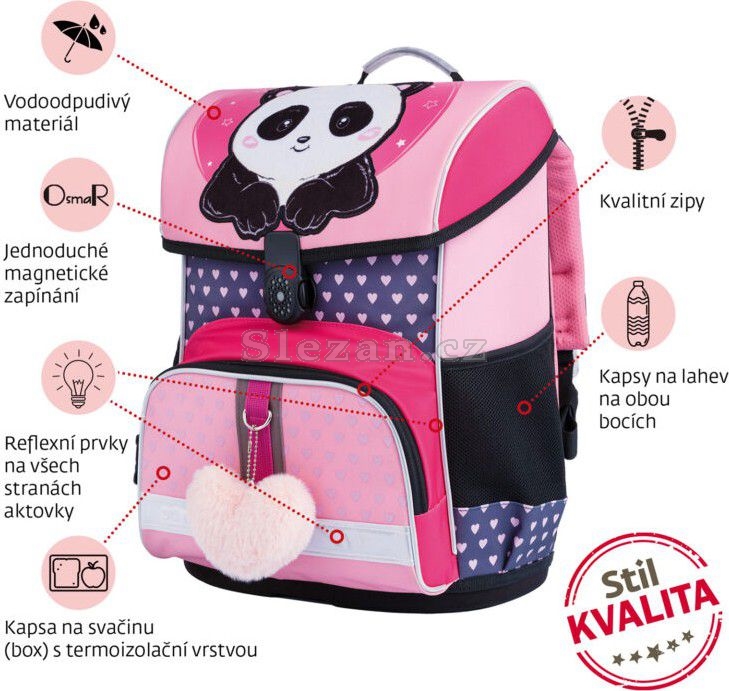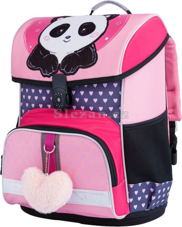 - PLYŠOVÝ PŘÍVĚSEK - aktovka je doplněná měkoučkým přívěskem ve tvaru srdce a hebká plyšová panda na víku přímo vybízí k pohlazení