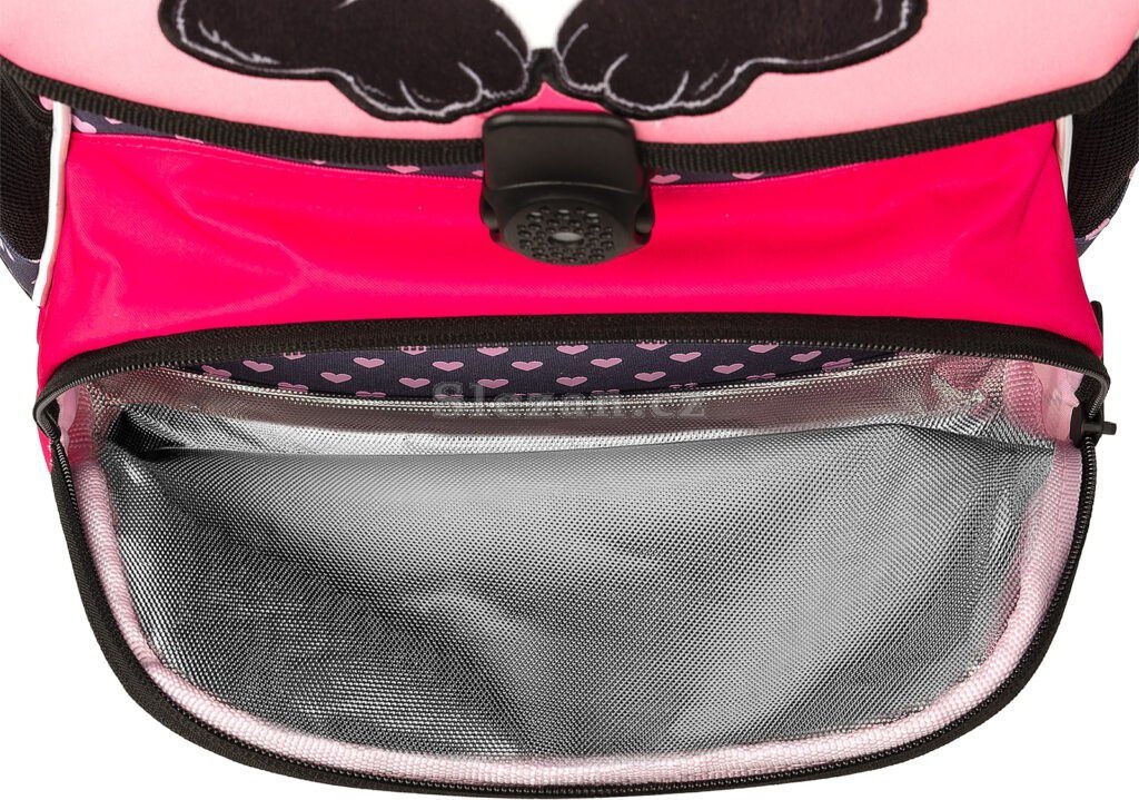 - VNITŘNÍ USPOŘÁDÁNÍ - hlavní vnitřní komora je rozdělená látkovou přepážkou pro lepší uložení pomůcek. V přední části komory je kapsička pro uložení drobností. Přední kapsa aktovky je určena pro svačinový box a je částečně termoizolační. Udrží vaše jídlo studené nebo teplé.
