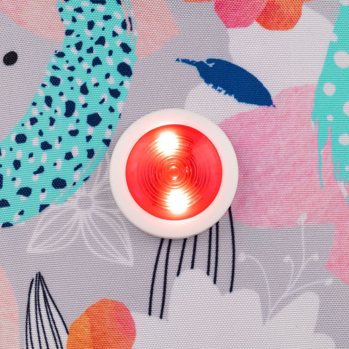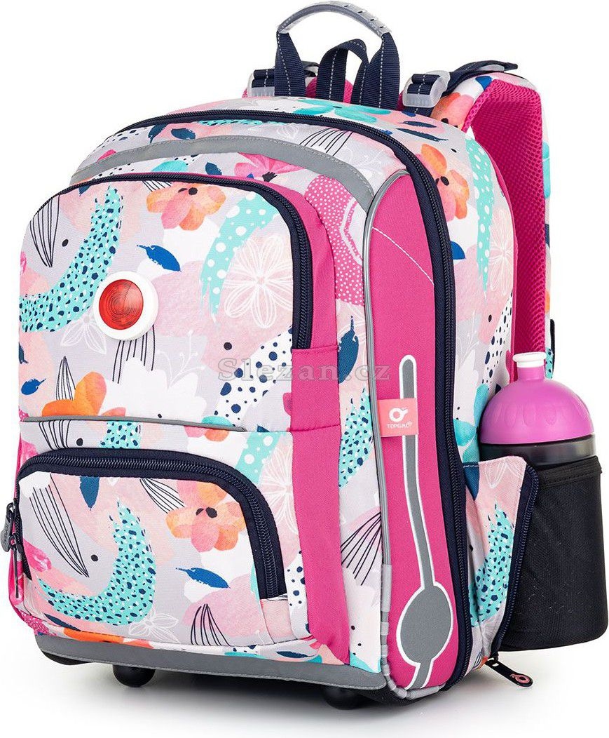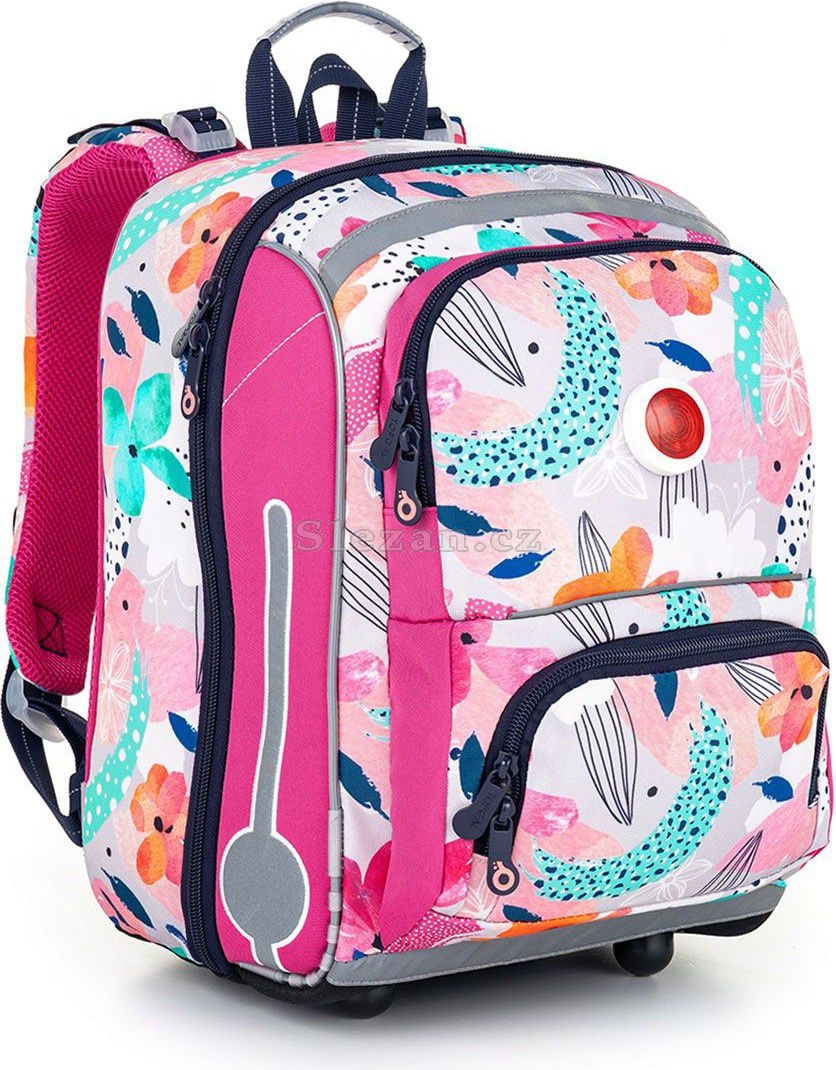 V přední části aktovky BEBE najdete další dvě kapsičky na zip. Na horní kapsičce je našitá blikačka, která může svítit nebo blikat ve třech programech. Uvnitř horní kapsy najdete jmenovku a malou síťovou kapsu na zip. Do horní kapsy se vejde krabička na svačinku. Spodní kapsička je menší, pojme potřebné drobnosti jako klíče nebo kapesníčky.