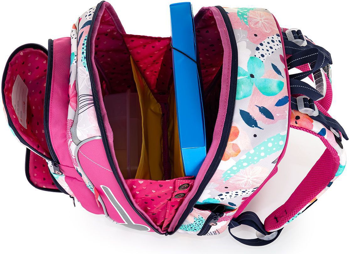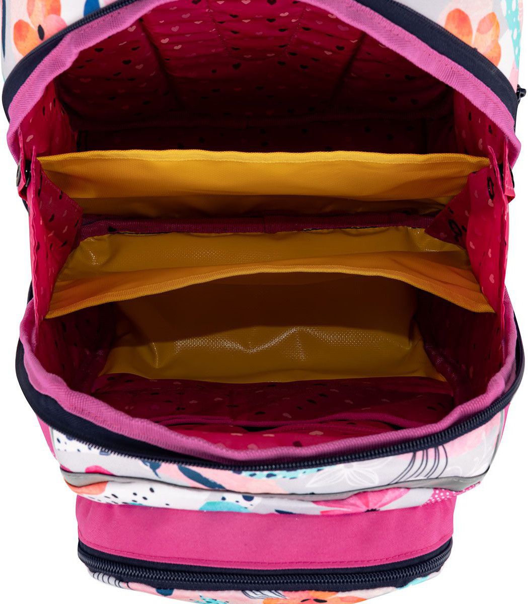 Jedna hlavní komora aktovky BEBE usnadní dítěti organizaci a rozdělení všech školních pomůcek uvnitř aktovky. Vnitřní prostor aktovky BEBE je členěn na tři části žlutými nepropustnými přepážkami. Uvnitř hlavní komory najdete i organizér - třeba na uložení čipových karet, tužky a další drobnosti. Navíc je zde i malá uzavíratelná kapsa na zip. Lahev s pitím doporučujeme umístit na bok aktovky do kapsičky, která je schovaná pod zipem.
