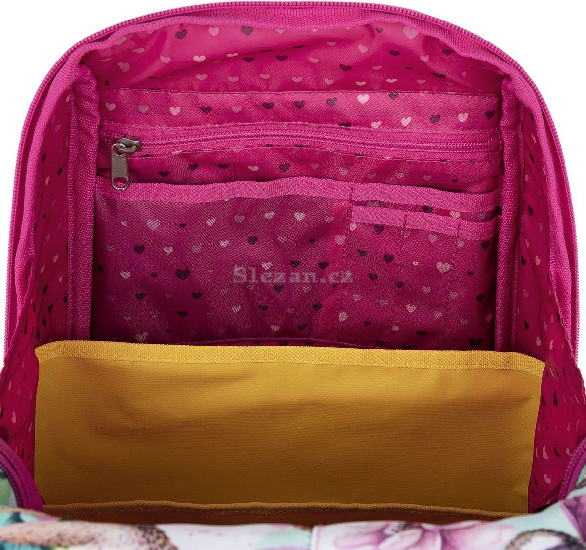 Batoh má jednu velkou komoru se žlutým nepropustným organizérem. Na přední části aktovky najdete další dvě praktické kapsy na zip s blikačkou. Ve vnitřní kapse jmenovku.