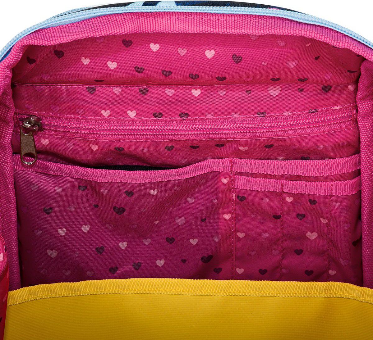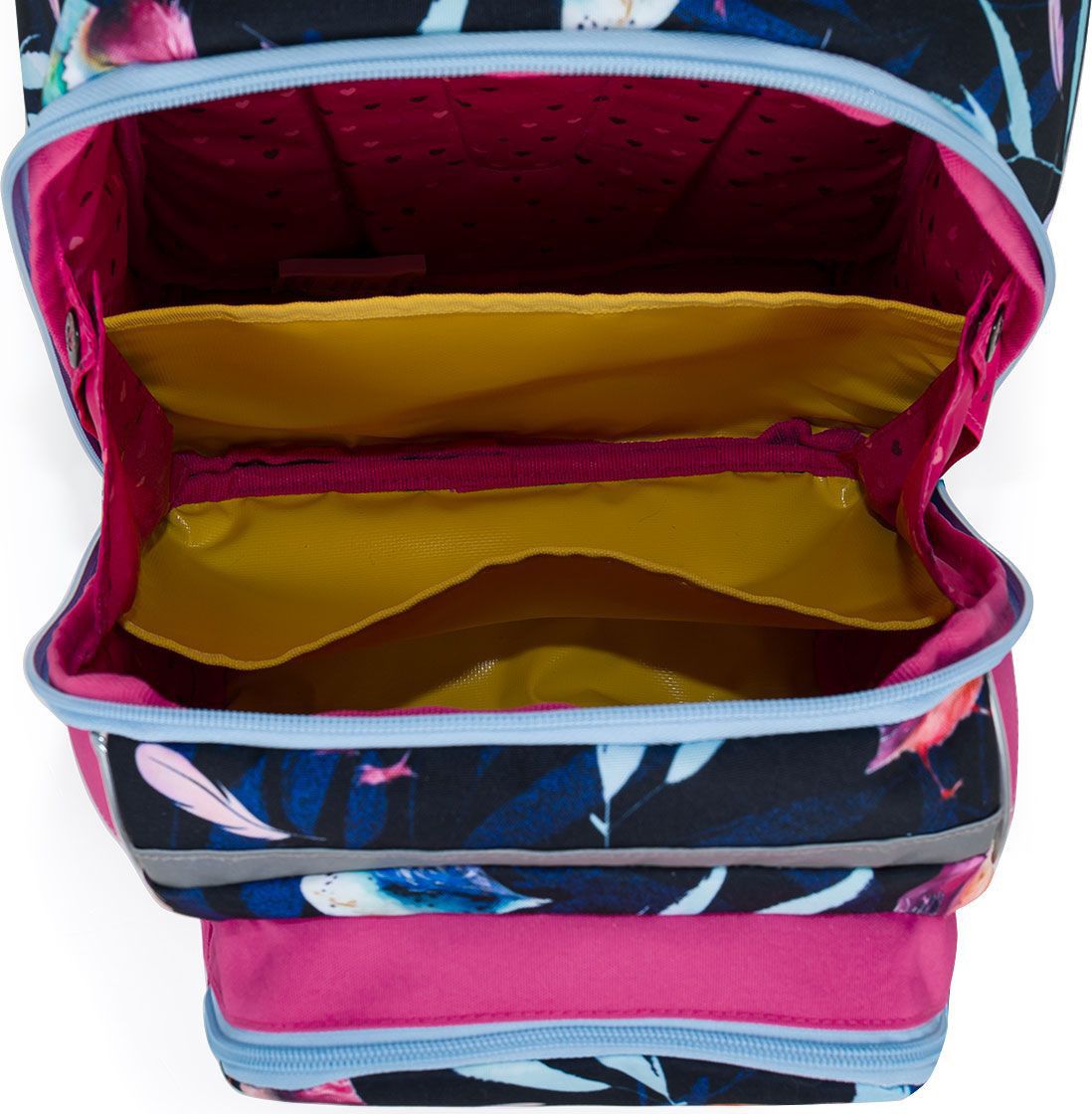 Batoh má jednu velkou komoru se žlutým nepropustným organizérem. Na přední části aktovky najdete další dvě praktické kapsy na zip, ve vnitřní kapse jmenovku.