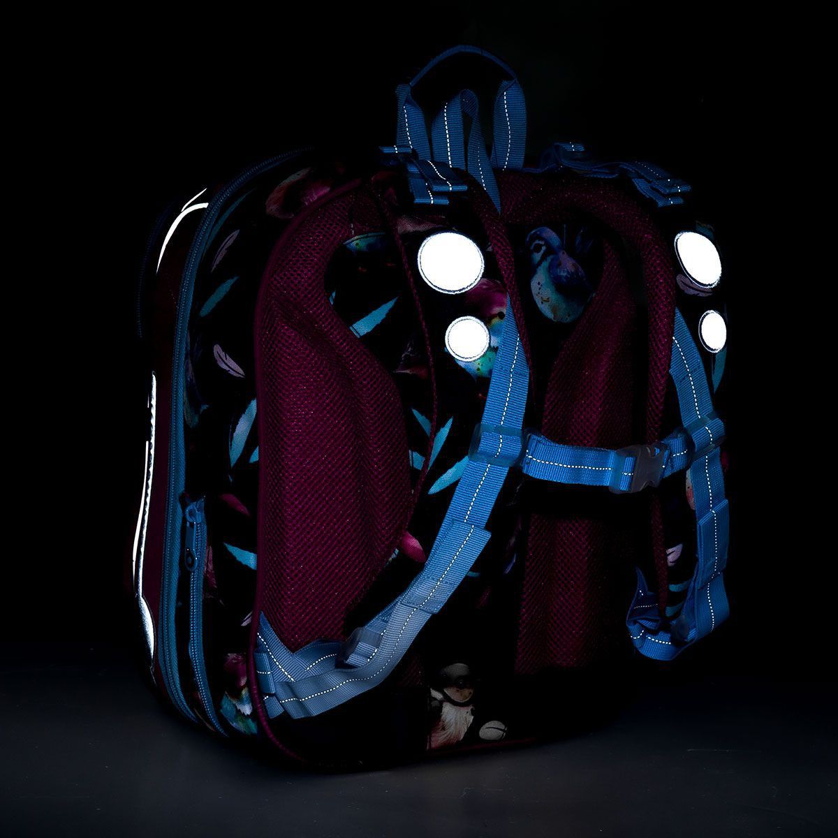 - reflexní prvky: na čele a bocích batohu, na ramenních popruzích