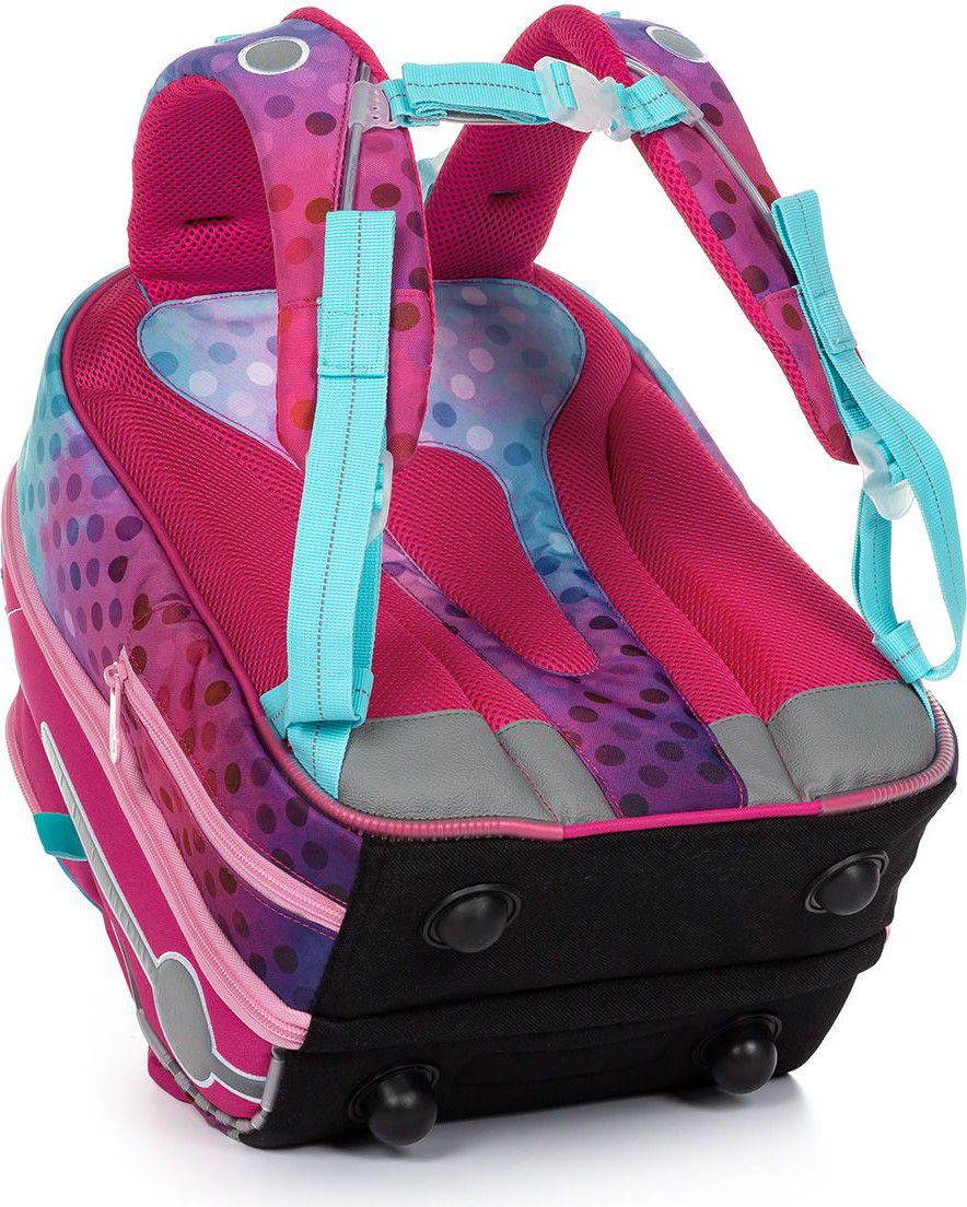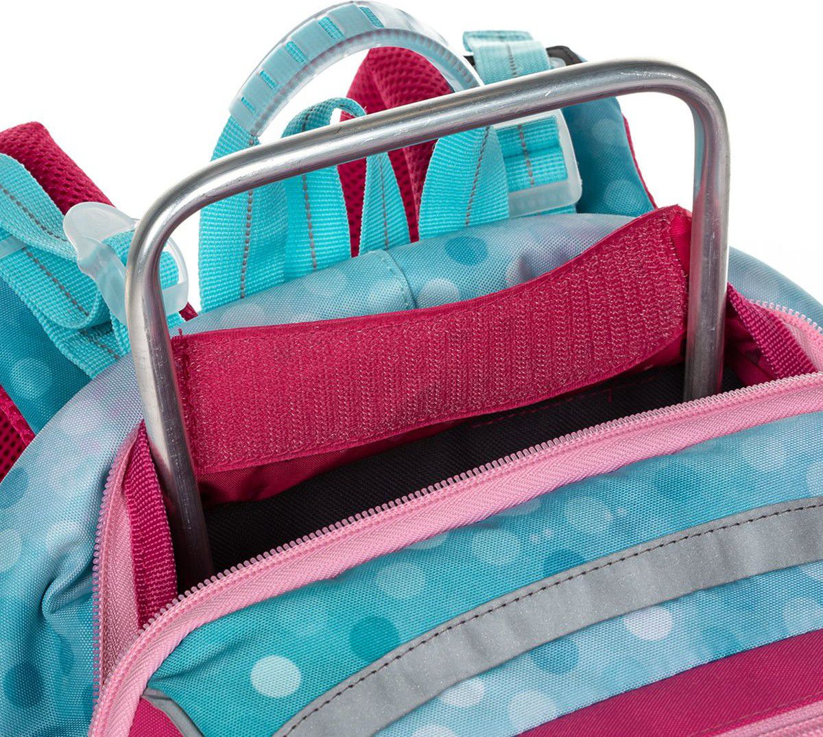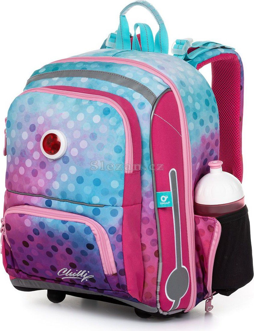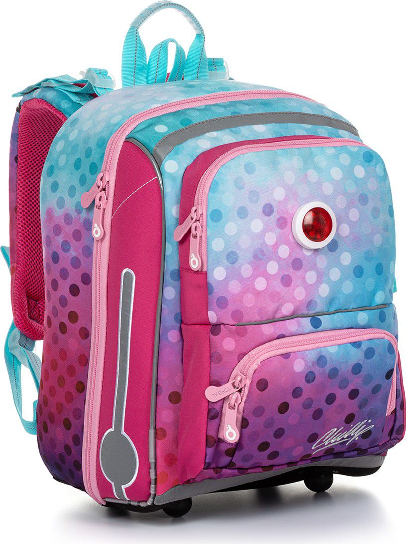 Aktovka pro nejmenší školačky s blikačkou na přední kapse a přehledným jednokomorovým členěním. ideální do 1. - 2. třídy anatomicky tvarovaná pevná zádová část s výztuhou aktovka má stabilní základnu nastavitelné ramenní popruhy a hrudní pás