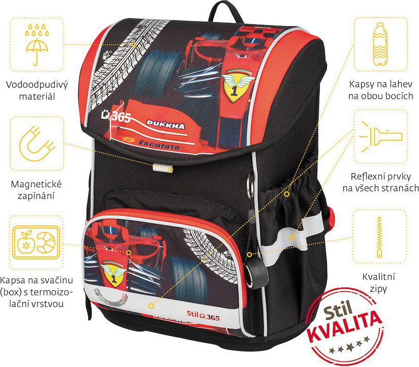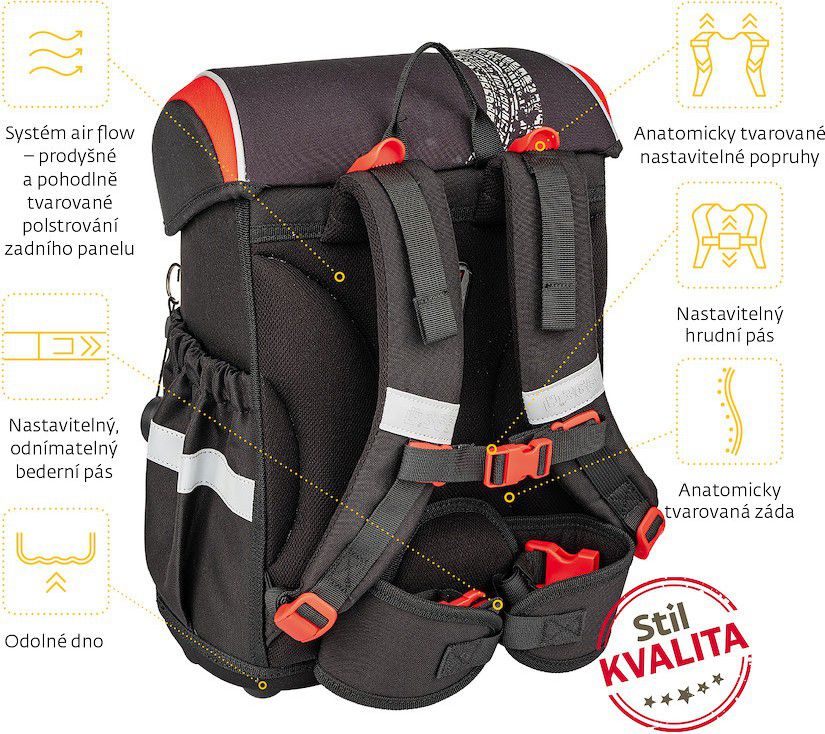- POHODLÍ – výškově nastavitelný hrudní a nově i odnímatelný bederní pás s kvalitní přezkou zajistí pohodlné usazení aktovky na zádech dítěte i správné rozložení váhy