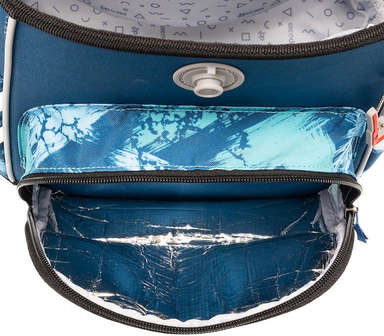 - VNITŘNÍ USPOŘÁDÁNÍ – prostorná hlavní vnitřní komora je rozdělená látkovou přepážkou pro uložení boxu na sešity či knih. Součástí hlavní komory je také kapsička pro uložení drobností, odepínatelný kroužek na klíč a štítek na jméno a adresu. Ve víku je průhledná kapsička na rozvrh hodin