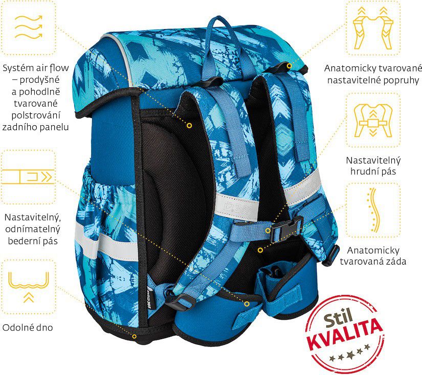 - POHODLÍ – výškově nastavitelný hrudní a nově i odnímatelný bederní pás s kvalitní přezkou zajistí pohodlné usazení aktovky na zádech dítěte i správné rozložení váhy
