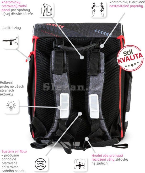 - 3D ZÁDOVÝ SYSTÉM - Aktovka perfektně sedí na zádech. Anatomický zádový panel se přizpůsobí páteři dítěte a systém Air Flow a prodyšné polstrování umožní cirkulaci vzduchu a příjemné nošení. Hrudní pás s kvalitní přezkou zajistí dobré usazení aktovky na zádech dítěte.