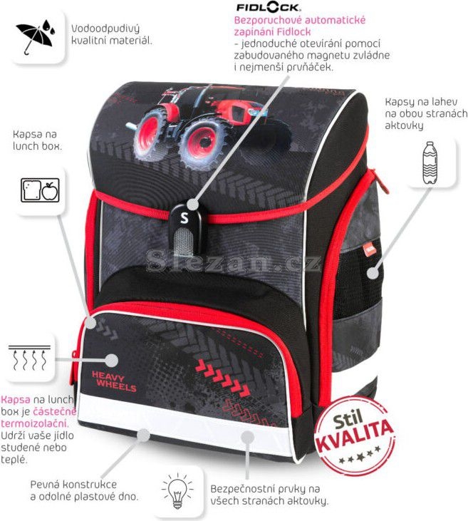 - FIDLOCK - moderní patentové zapínání s magnetem pro snadné otevírání a zavírání aktovky jednou rukou. Velmi praktické a jednoduché řešení pro školáky - při přiložení víka se samo zapne.
