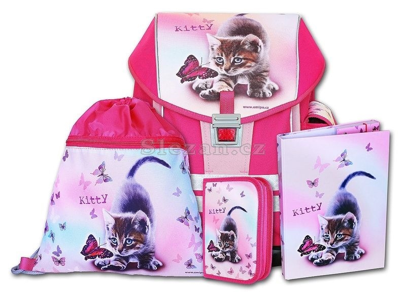 Školní aktovkový set obsahuje: školní aktovku, dvouklopový penál, sáček s velkou kapsou na zip a box na sešity A4.