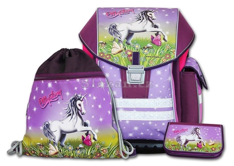 Vnitřní část školní aktovky je členěna variabilní všitou přepážkou na tři části. Tím je zajištěna větší efektivita pro vnitřní uspořádání jednotlivých školních pomůcek (sešitů, knih apod.) podle individuální potřeby žáka. Na předním dílu je našita dále velká kapsa rozměrů š.215 x h.50 x v.270mm. Její horní část kapsy se uzavírá pomocí popruhu se suchým zipem. Uvnitř kapsy je našita síťovaná kapsička na zip. Přes celou šířku přední kapsy jsou našity dva bezpečnostní reflexní pásky, dále pak potom i přes obě boční kapsy jeden a stejně tak na nosných řemenech. Aktovka je uzavřena prostorově tvarovanou klopnou přes celý svůj obvod, včetně přední kapsy. Tím je chráněn obsah aktovky před znehodnocením při deštivém počasí. Na vnitřní straně klopny je rozvrh hodin. Použité vnější textilní materiály (převážně PES) jsou opatřeny na povrchu vodoodpudivou impregnací. Klopna je zajištěna proti otevření kovovým aktovkovým zámkem s reflexní odrazkou. Zámek díky svému uchycení, lze jednoduše otevřít jednou rukou. Zadní část aktovky tvoří nově vyvinuté ergonomické polstrování ze speciální síťoviny s vetkanou PU pěnou, která zajišťuje optimální cirkulaci vzduchu v zádové části. Oba tyto faktory přispívají nejen k pohodlnému nošení aktovky, ale také zajišťují správné zatížení a vývoj páteřního systému. V horní části zádové části se ještě nachází textilní poutko pro zavěšení aktovky na lavici a ergonomické držadlo. Dolní část batohu je opatřena jednolitým plastovým dnem, které umožňuje dlouhodobé stání aktovky na mokré podložce, aniž by hrozilo znehodnocení jejího obsahu. Korpus aktovky je na každém boku osazen prostornou boční kapsou. Se síťovinou je určena na lahev s pitíčkem a s klopničkou na penál nebo svačinu. Při celkových rozměrech š.370 (včetně kapes) x h.230 x v.395mm váží batoh jen pouhých 0,95kg! Naše společnost Vám nabízí extra lehkou kvalitní školní aktovku s pevnou konstrukcí, tříletou zárukou a doživotně bezplatným servisem!