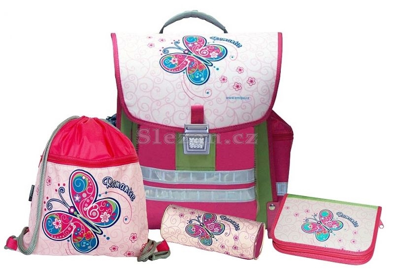 školní aktovku, sáček s kapsou na zip, penál s dvěma klopami a etui.
