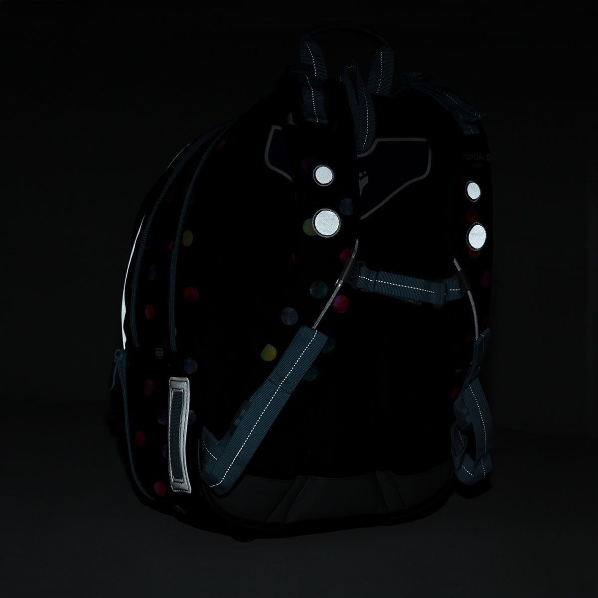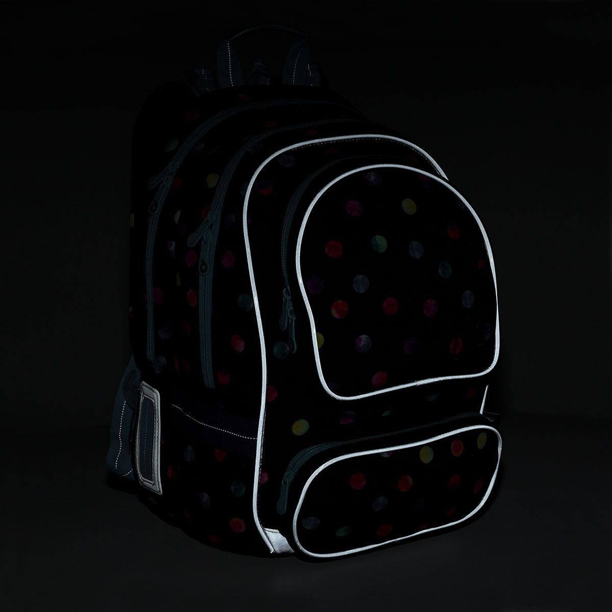 Kapsičku na lahev na pití najdete na boku batohu. Děti potřebují být vidět, zvláště v zimním období, proto je batoh opatřen řadou reflexních prvků na ramenních popruzích, čele i boku batohu.