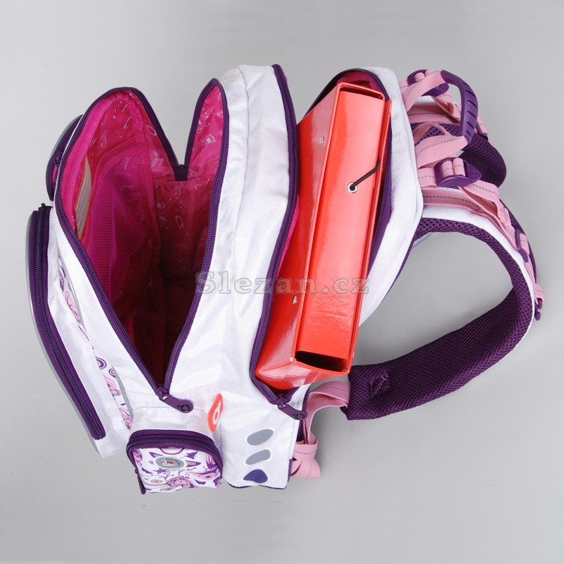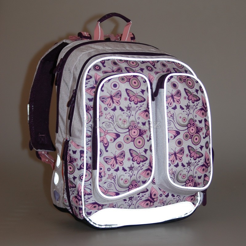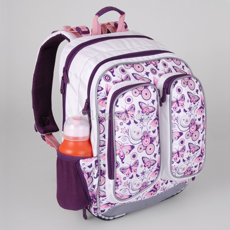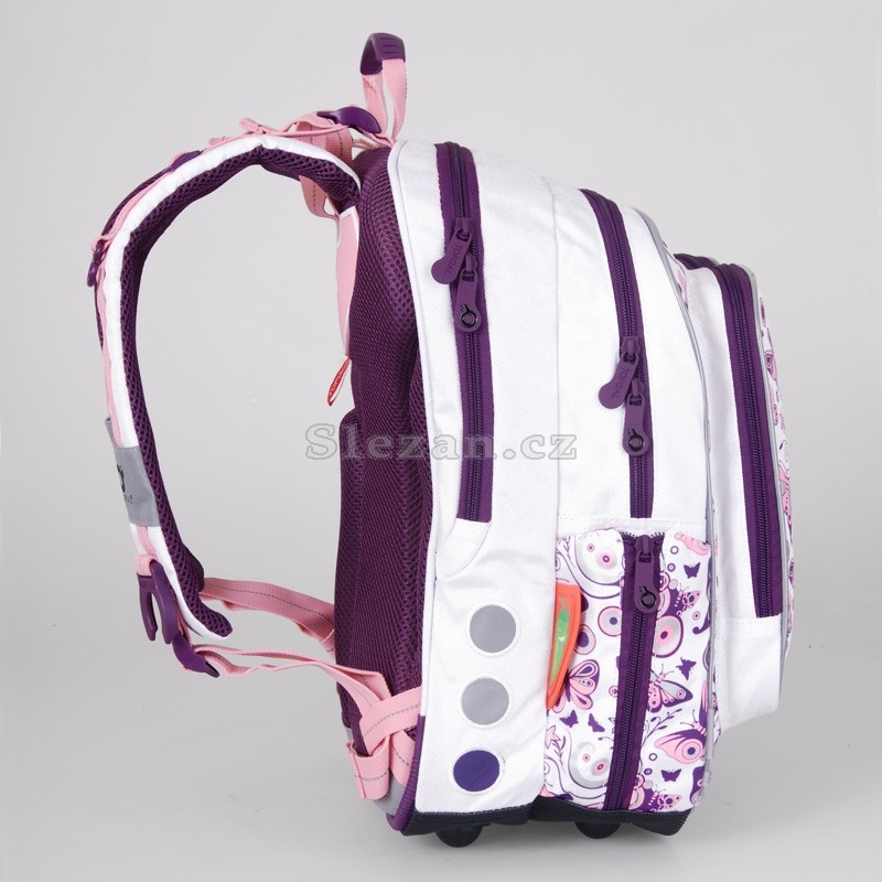 Klasický dvoukomorový školní batoh s hravým designem pro nejmenší školačky v 1. až 3. třídě. Ergonomicky tvarovaný zádový systém s polstrováním a vyjímatelným hliníkovým rámem společně s délkově nastavitelnými ramenními popruhy zajistí pohodlné a bezpečné používání tohoto batohu. Zadní i prostřední komory jsou stejně velké. V přední komoře je praktický organizér a šikovná kapsa ze síťoviny. Na jedné straně batohu je menší elastická kapsa na 1l láhev s pitím. ¨ Druhá menší postranní kapsa obsahuje poutko s karabinou, na kterou je možné zavěsit pytlík na přezůvky nebo si lze do kapsy uschovat jiné drobnosti. Do přední části batohu jsou další dvě podlouhlé kapsy na zip, které svým tvarem připomínají motýlí křída. Do těchto kapes se kromě dalších menších věcí vejde školní pouzdro. V jedné z těchto kapes je jednoduchá karabina na klíče. Na popruzích jsou umístěny háčky pro zavěšení dlouhých konců popruhů a držák na PET lahev. Kromě úchytu s plastovou rukojetí na pohodlné přenášení batohu v ruce je přidáno i poutko na zavěšení batohu na školní lavici. Batoh je doplněn o četné reflexní plochy pro zvýšení viditelnosti školáka za každých povětrnostních podmínek. Dno batohu je chráněno pevným materiálem, plastovými nožkami a zpěvněné jsou také spodní hrany. Součástí batohu je: Pláštěnka na batoh Pytlík na přezůvky Box na svačinu . Výrobce TOPGAL Barva Zelená Ergonomické tvarování Ano Hmotnost 1,06 kg Kolekce Chilli 2010 Materiál 100% Nylon Nosnost 7 kg Pro kluka / holku? Holka Reflexní prvky Ano Rozměry 41 x 29 x 19 cm Třída (ZŠ) 1. - 3.