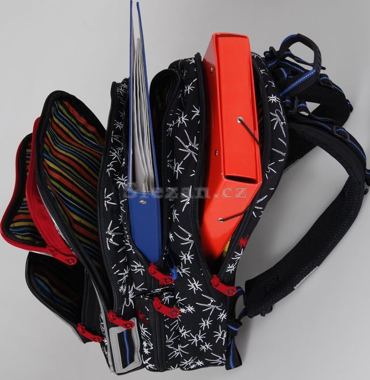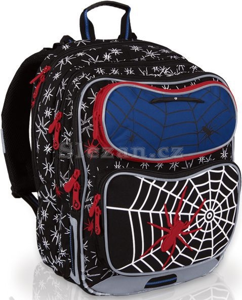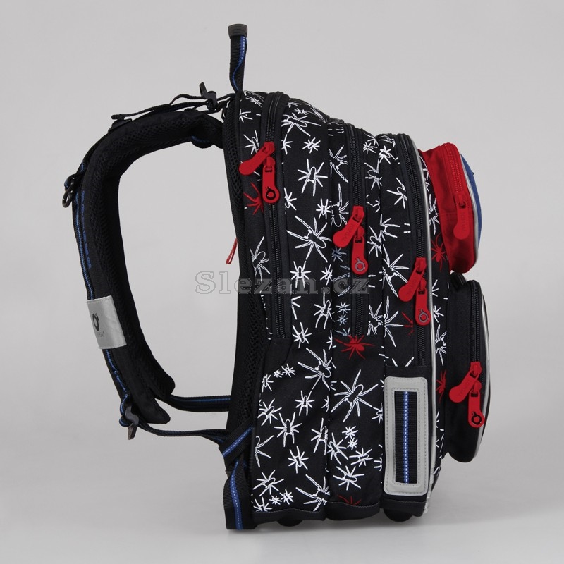V prostřední komoře je zipová kapsa ze síťoviny a v přední komoře je praktický organizér. V horní kapsičce je jednoduchá karabina na klíče. Spodní a větší kapsa je určena pro uložení boxu na svačinu nebo školního pouzdra CHI 613 se stejným motivem (není součástí batohu). Na této kapse je plastická výšivka pavouka. Na jedné straně batohu je menší elastická kapsa na 0,75l láhev s pitím. Po obou stranách batohu jsou poutka z popruhu, na které je možné zavěsit pytlík na přezůvky. Pro oživení vnitřního prostoru má batoh do školy pestrobarevnou podšívku.