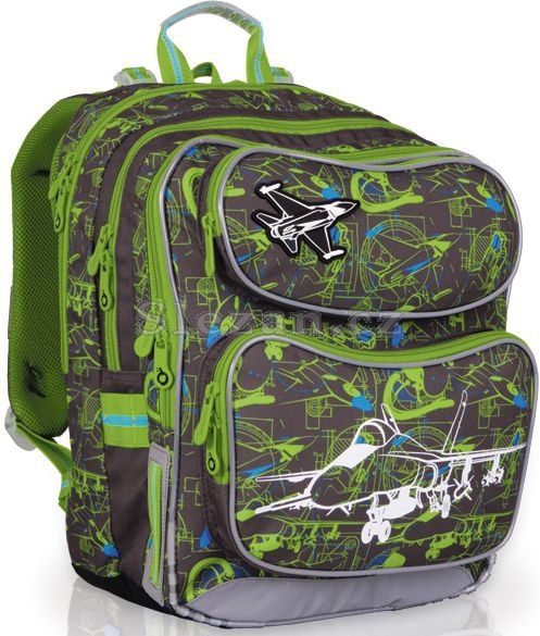 Tříkomorový školní batoh s plastickou nášivkou stíhačky, pro nejmenší školáky 1. až 3. třídy