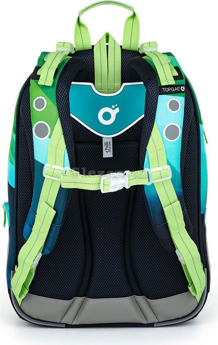Polstrované a ergonomicky tvarované jsou i ramenní popruhy, které zajistí pohodlné každodenní nošení i hodně těžkého školního nákladu. Ramenních popruhy lze regulovat na délku v jejich spodní části, ale můžete je utáhnout i k zádům v horní části. Samozřejmostí je výškově nastavitelný hrudní pás.