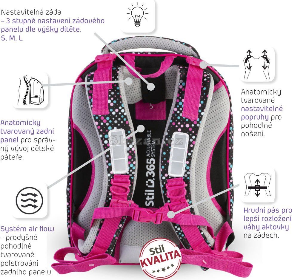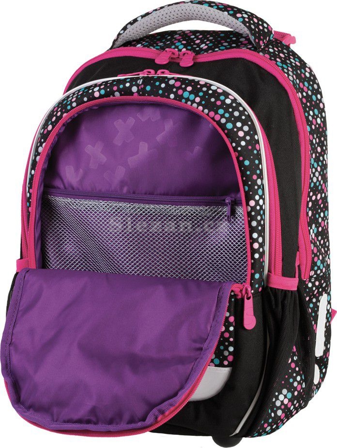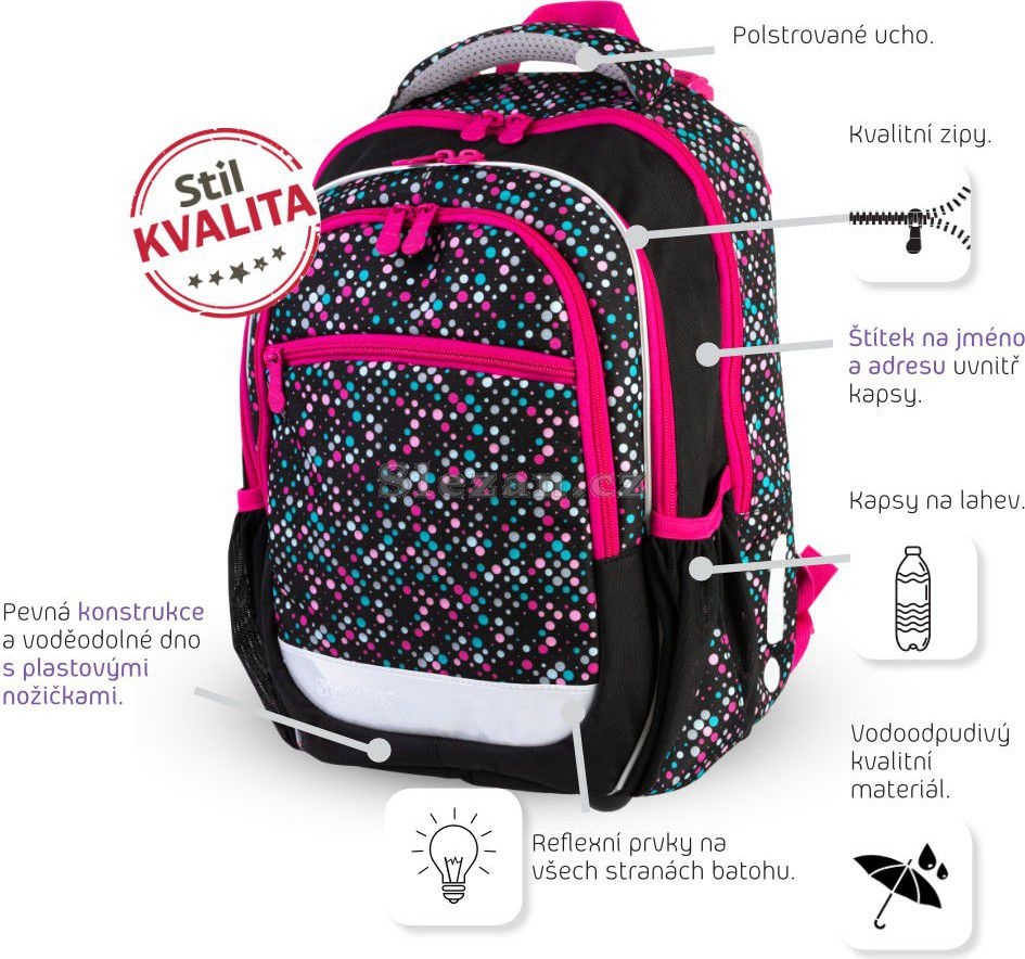Kvalitní, ergonomicky tvarovaný odlehčený školní batoh je vybaven reflexními prvky na všech stranách batohu a anatomicky tvarovanými zády s pevnou konstrukcí. Systém air flow – prodyšné a pohodlně tvarované polstrování zadního panelu. Vnitřní uspořádání batohu: Skládá se ze 3 prostorných komor opatřených pevnými zipy a přední kapsy pro uložení drobných předmětů. Těžké věci jsou uloženy nejblíž k zádům, což přispívá ke správnému držení těla školáka. Hrudní pás - pro optimální rozložení zátěže na zádech s možností nastavení popruhů dle výšky dítěte. Anatomicky tvarované nastavitelné popruhy pro pohodlné nošení. Batoh má nastavitelná záda - 3 stupně nastavení zádového panelu dle výšky dítěte. Vyrobeno z kvalitního vodoodpudivého materiálu. Pevné a voděodolné dno z plastovými nožičkami. Rozměr: výška 40cm, šířka 30cm, hloubka 20cm Hmotnost: 0,9 kg Nosnost: 7 kg Objem: 20l