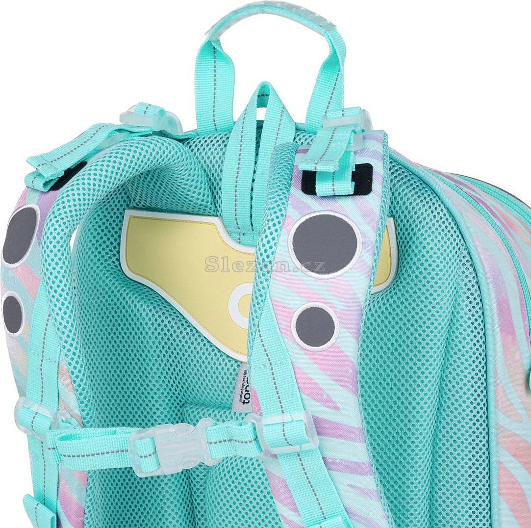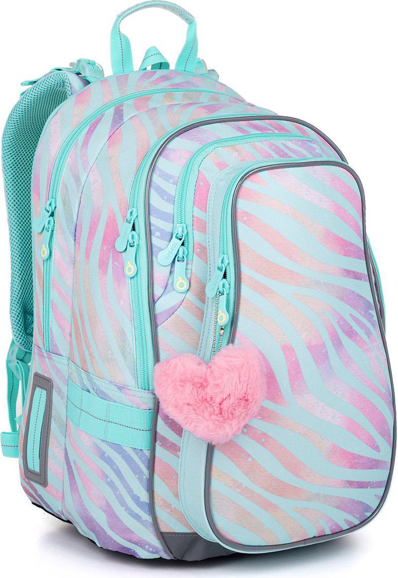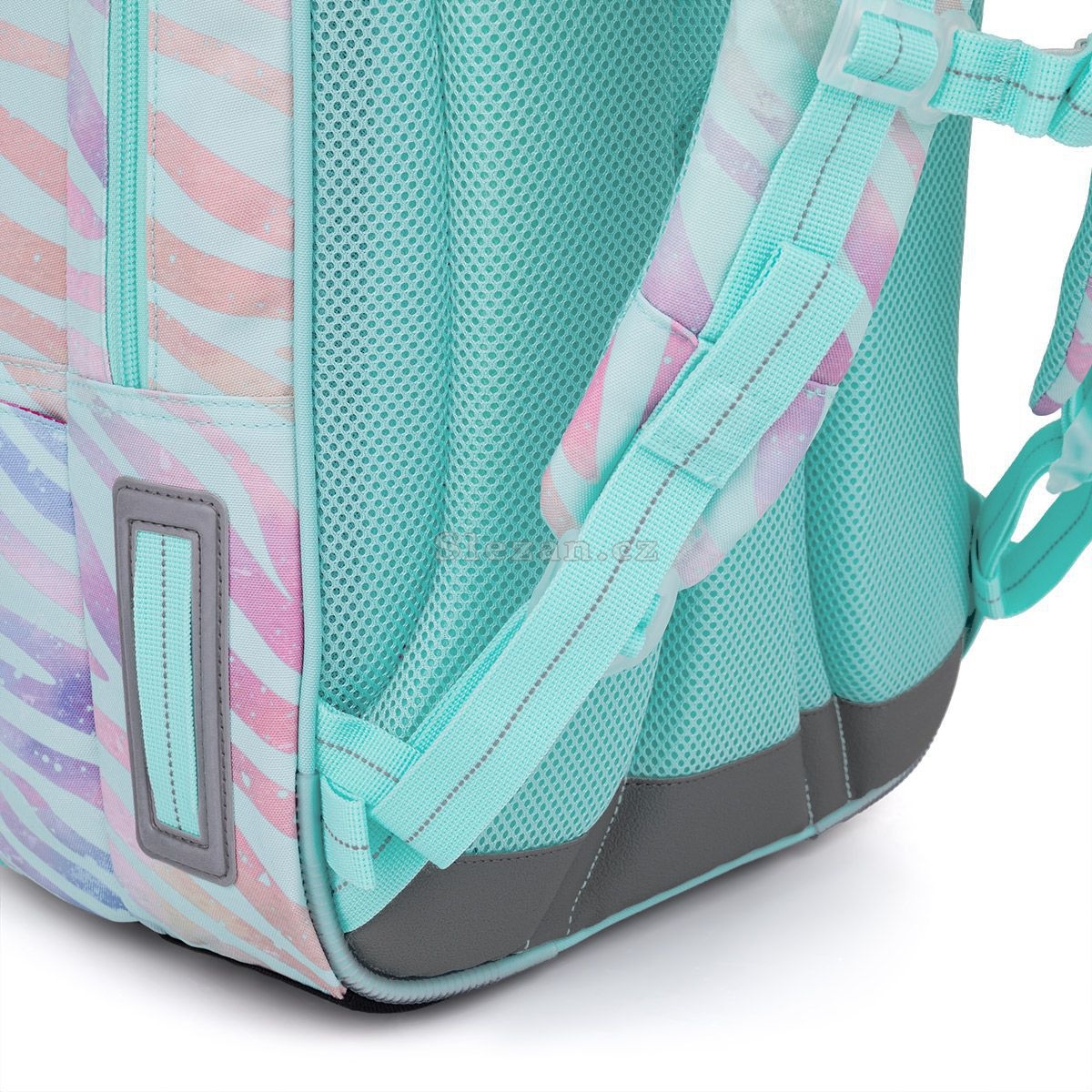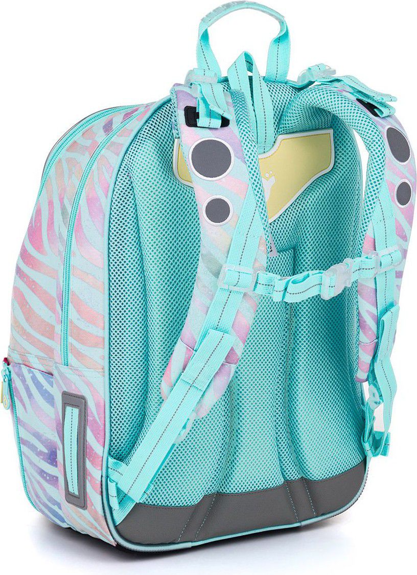 Zadní komora batohu je ideální na přenášení nejtěžších učebnic nebo desek na sešity. Do přední komory jsme přidali praktickou síťovou kapsičku na zip, třeba na doklady. Hluboká kapsa mezi přední komorou a kapsou na čele batohu má užší vstup, proto se skvěle hodí pro ve stejném designu nebo krabičku na svačinky.