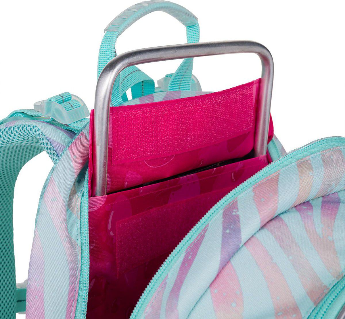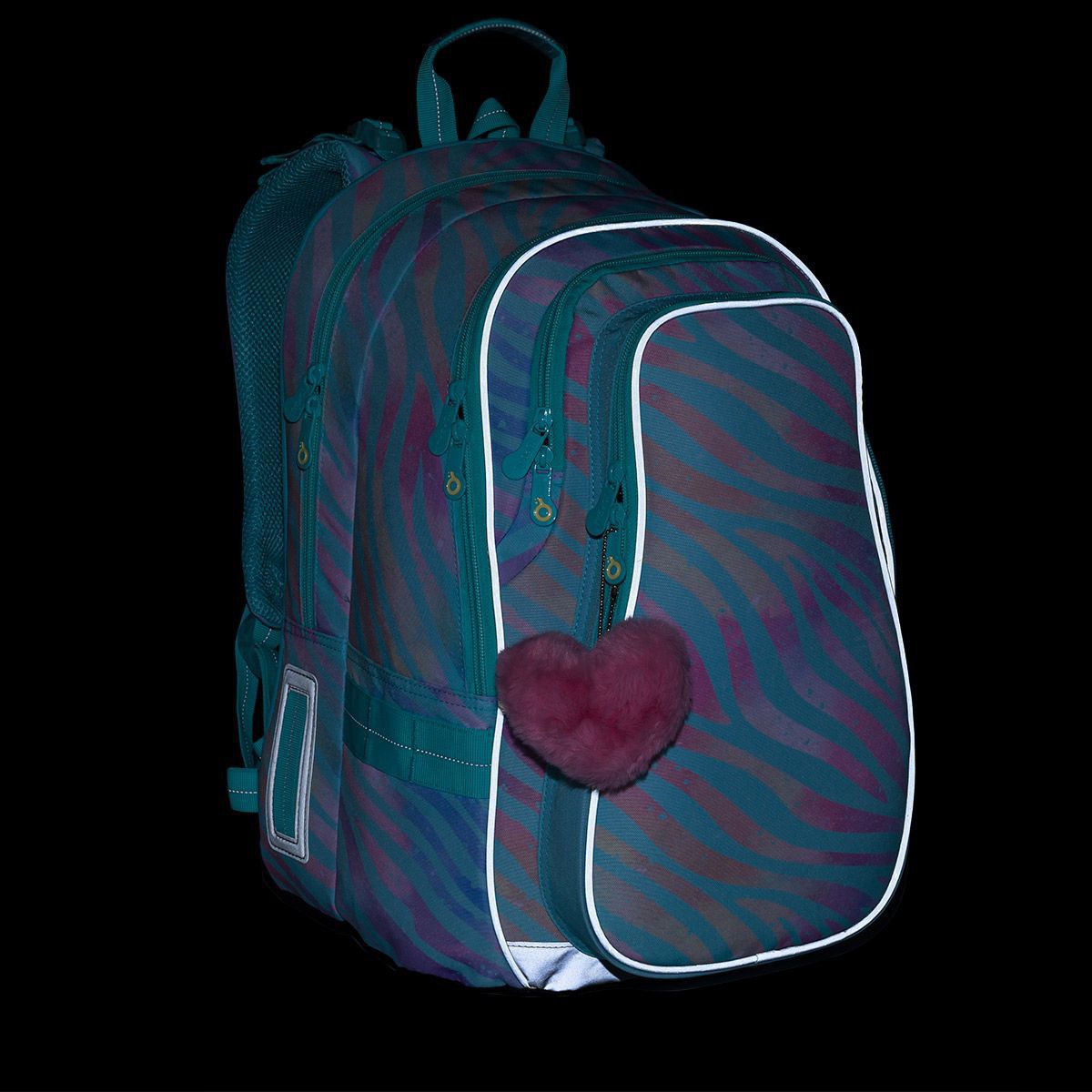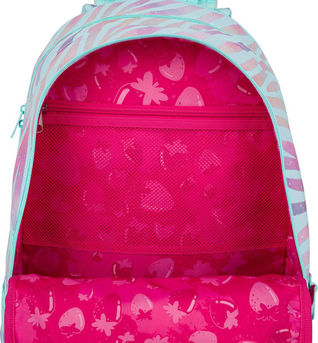 Zadní komora batohu je ideální na přenášení nejtěžších učebnic nebo desek na sešity. Do přední komory jsme přidali praktickou síťovou kapsičku na zip, třeba na doklady. Hluboká kapsa mezi přední komorou a kapsou na čele batohu má užší vstup, proto se skvěle hodí pro ve stejném designu nebo krabičku na svačinky.