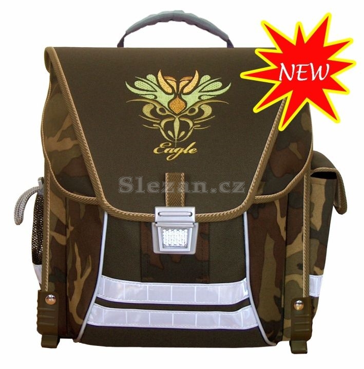 Vnitřní část školního batohu je členěna pohyblivou přepážkou na dvě části. Její plynule měnitelná poloha umožňuje větší variabilitu vnitřního uspořádání a tím i uložení jednotlivých pomůcek (sešitů, knih apod.) podle individuální potřeby žáka. Na této přepážce je našita členěná kapsa ze síťoviny pro uložení např. sešitů formátu A5, žákovské knížky, mobilu, hygienických kapesníčků apod. Dále je tam našito poutko s plastovým oválkem pro zavěšení svazku klíčů. Horní obvod této vnitřní části je opatřen stahovací šňůrkou s brzdičkou. Toto řešení umožňuje měnit velikost celkového objemu vnitřní části školního batohu, podle vkládaného množství učebních pomůcek. Na předním dílu je našita velká kapsa rozměru š.250 x h.50 x v.230mm. V horní části je uzavíratelná na zip. Ve střední části je umístěn kovový zámeček. Přes celou šířku přední kapsy a přes obě boční kapsy je našit bezpečnostní reflexní pásek. Školní batoh je uzavírám prostorově tvarovanou a vyztuženou klopnou přes celý svůj obvod, včetně přední kapsy. Tím je chráněn obsah před znehodnocením při deštivém počasí. Na vnitřní části klopny je našita plastová kapsička s týdenním rozvrhem hodin a jmenovkou. Zadní část batohu je opatřena anatomicky tvarovanými zády vyrobenými z gumové pěny na povrchu potažené bavlněnou textilií. Jejich tuhost je nastavena tak, aby se jednak neprotláčel obsah batohu do zad školáka a také aby tzv. seděla na zádech a držela správnou polohu páteře. Dolní část batohu je opatřena ochrannými plastovými rohy, které mimo jiného, umožňují dlouhodobé stání aktovky na mokré podložce, aniž by hrozilo znehodnocení jejího obsahu. Při celkových rozměrech š.310 x h.190 x v.370mm váží batoh pouhých 0,98kg
