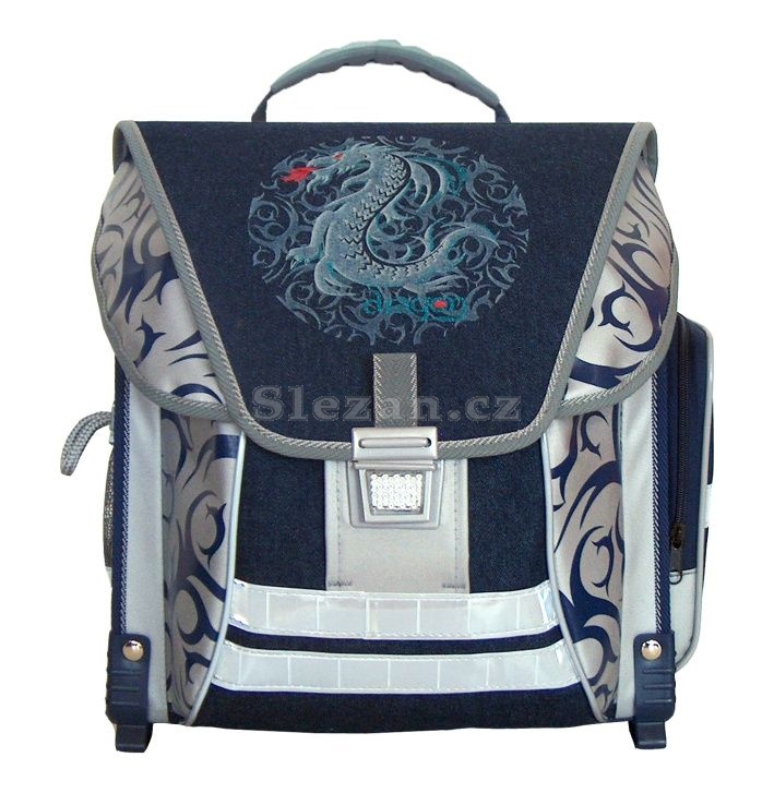 Vnitřní část školního batohu je členěna pohyblivou přepážkou na dvě části. Její plynule měnitelná poloha umožňuje větší variabilitu vnitřního uspořádání a tím i uložení jednotlivých pomůcek (sešitů, knih apod.) podle individuální potřeby žáka. Na této přepážce je našita členěná kapsa ze síťoviny pro uložení např. sešitů formátu A5, žákovské knížky, mobilu, hygienických kapesníčků apod. Dále je tam našito poutko s plastovým oválkem pro zavěšení svazku klíčů. Horní obvod této vnitřní části je opatřen stahovací šňůrkou s brzdičkou. Toto řešení umožňuje měnit velikost celkového objemu vnitřní části školního batohu, podle vkládaného množství učebních pomůcek. Na předním dílu je našita velká kapsa rozměru š.250 x h.50 x v.230mm. V horní části je uzavíratelná na zip. Ve střední části je umístěn kovový zámeček. Přes celou šířku přední kapsy a přes obě boční kapsy je našit bezpečnostní reflexní pásek. Školní batoh je uzavírám prostorově tvarovanou a vyztuženou klopnou přes celý svůj obvod, včetně přední kapsy. Tím je chráněn obsah před znehodnocením při deštivém počasí. Na vnitřní části klopny je našita plastová kapsička s týdenním rozvrhem hodin a jmenovkou. Zadní část batohu je opatřena anatomicky tvarovanými zády vyrobenými z gumové pěny na povrchu potažené bavlněnou textilií. Jejich tuhost je nastavena tak, aby se jednak neprotláčel obsah batohu do zad školáka a také aby tzv. seděla na zádech a držela správnou polohu páteře. Dolní část batohu je opatřena ochrannými plastovými rohy, které mimo jiného, umožňují dlouhodobé stání aktovky na mokré podložce, aniž by hrozilo znehodnocení jejího obsahu. Při celkových rozměrech š.310 x h.190 x v.370mm váží batoh pouhých 0,98kg