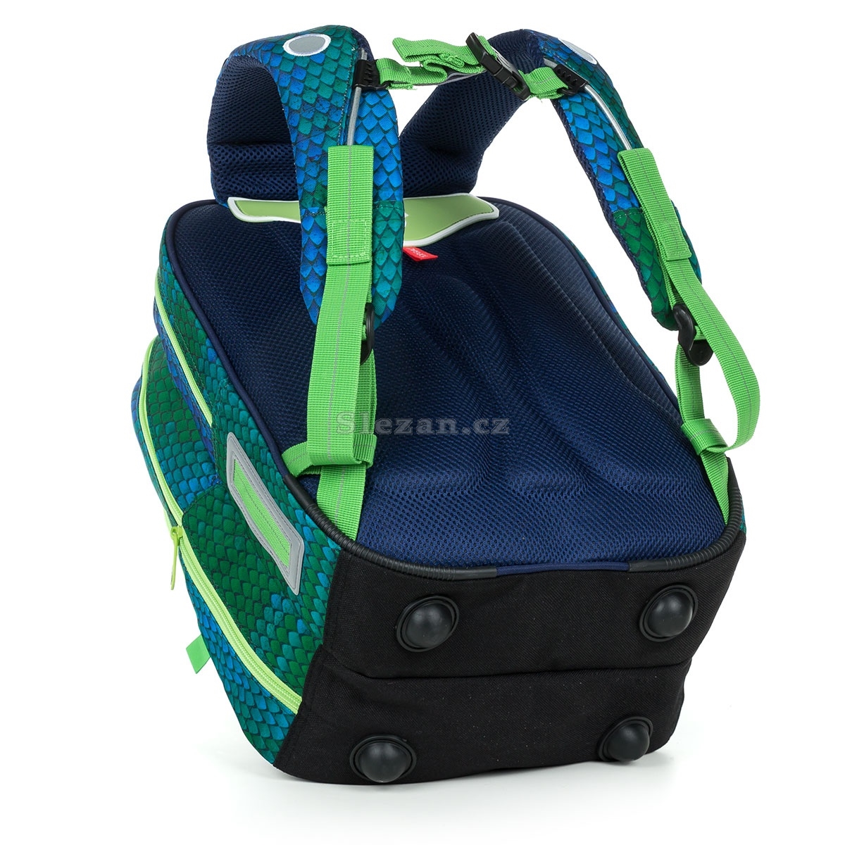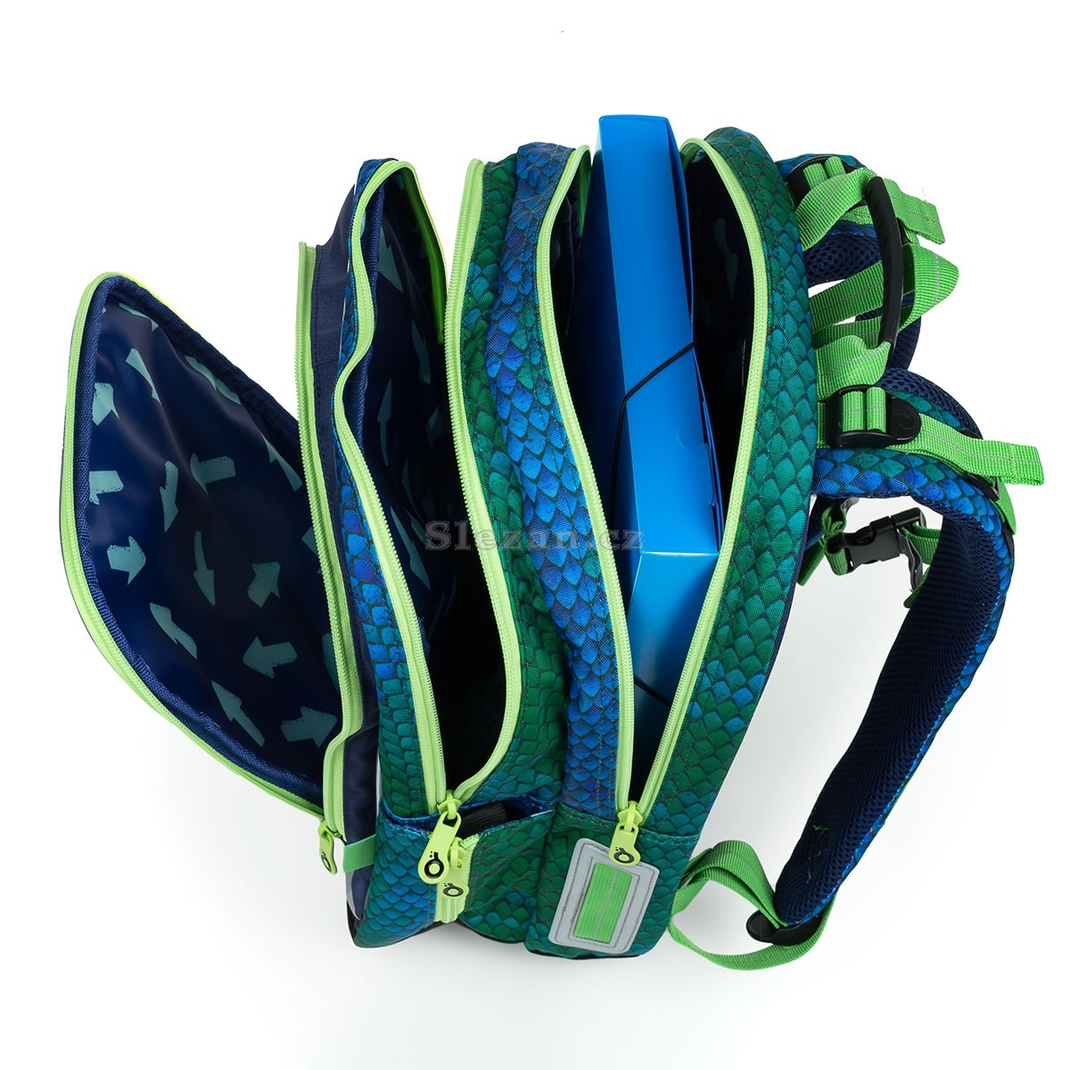 Dvě hlavní komory pohodlně pojmou všechno učivo minimálně prvních tří tříd ZŠ. Záleží ale i na požadavcích paní učitelky nebo pana učitele, kolik toho malí cvičitelé draků musejí nosit na zádech. Do zadní komory doporučujeme umístit ty nejtěžší učebnice a desky na sešity. V přední širší komoře pak najdete i malou síťovou kapsičku na zip a jmenovku.