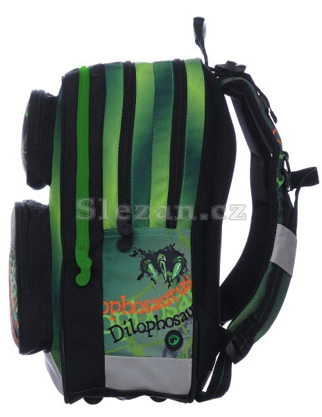 Přední dvě kapsy jsou potištěné ústředním motivem dinosaura, na spodní kapse je větší detailnější dinosaurus.