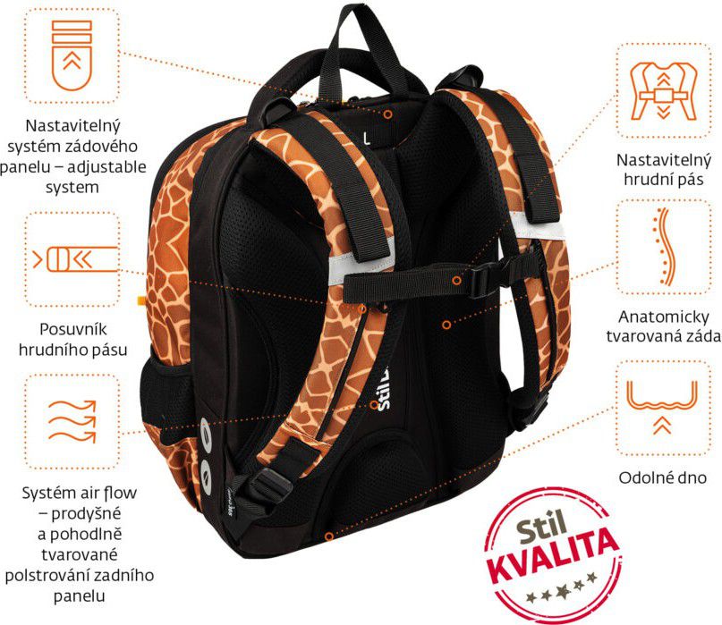 - STIL ADJUSTABLE SYSTEM – nastavitelný systém zad se třemi stupni pro optimální usazení batohu na zádech podle výšky a věku dítěte. Batoh, který roste s dítětem