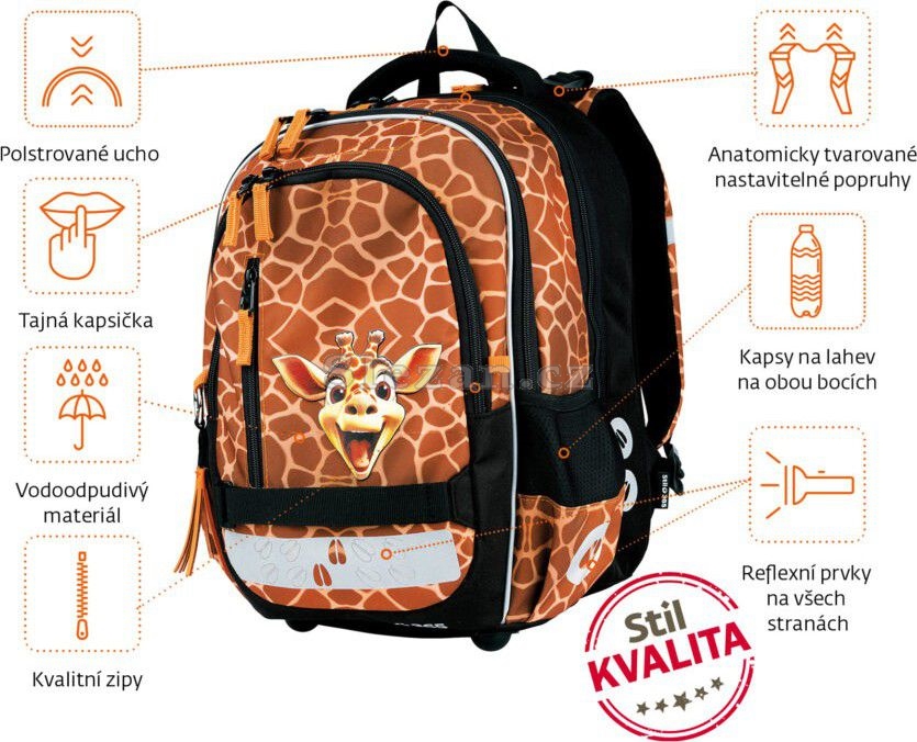 - BEZPEČNOST – bezpečnostní prvky jsou velmi důležité, proto je batoh vybavený reflexními prvky na všech stranách batohu, které zaručí lepší viditelnost a bezpečnost dítěte ve tmě