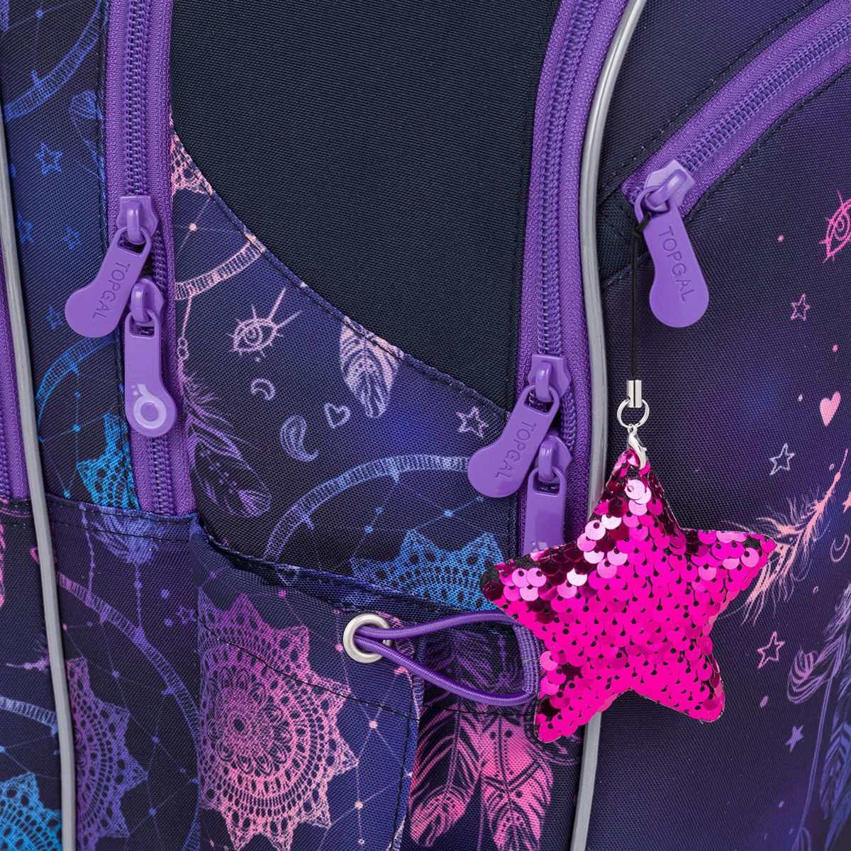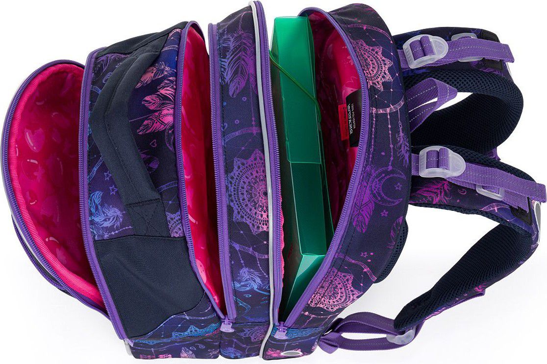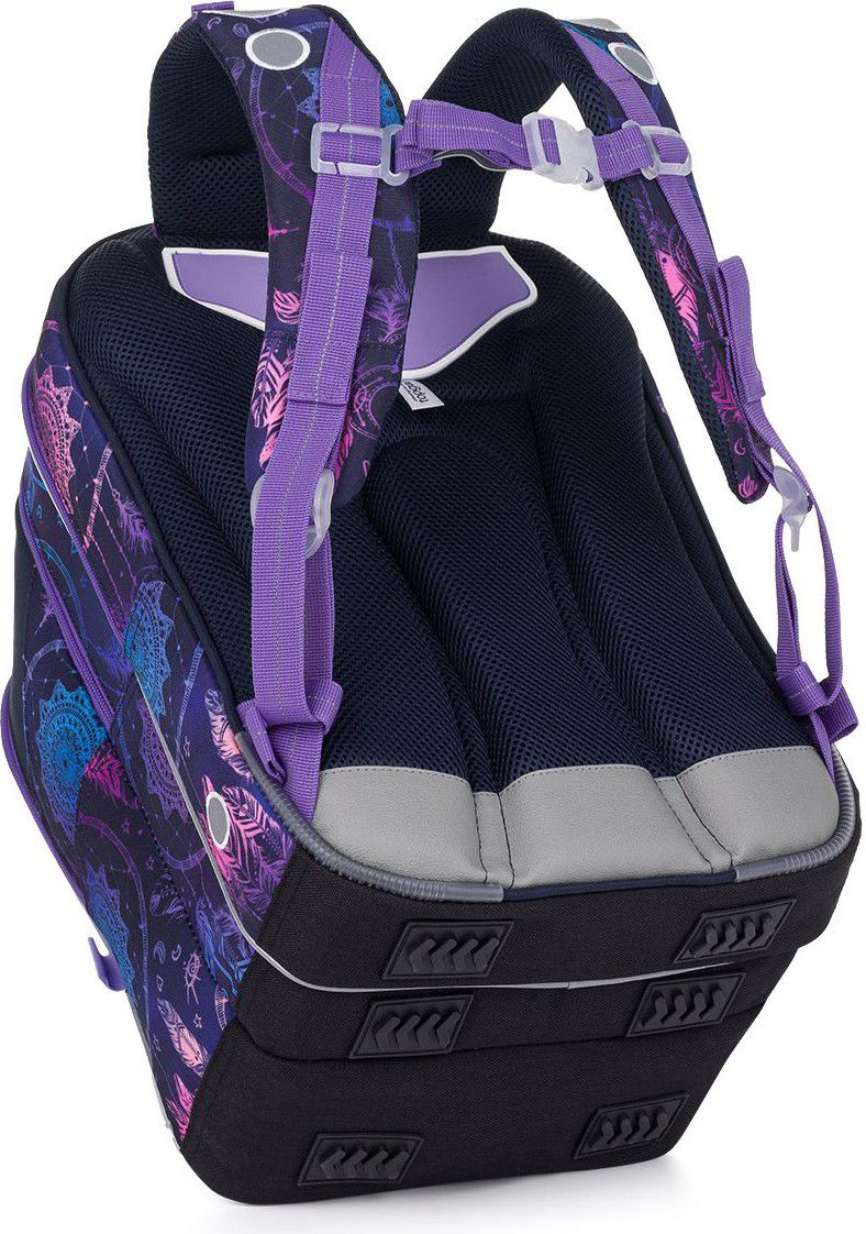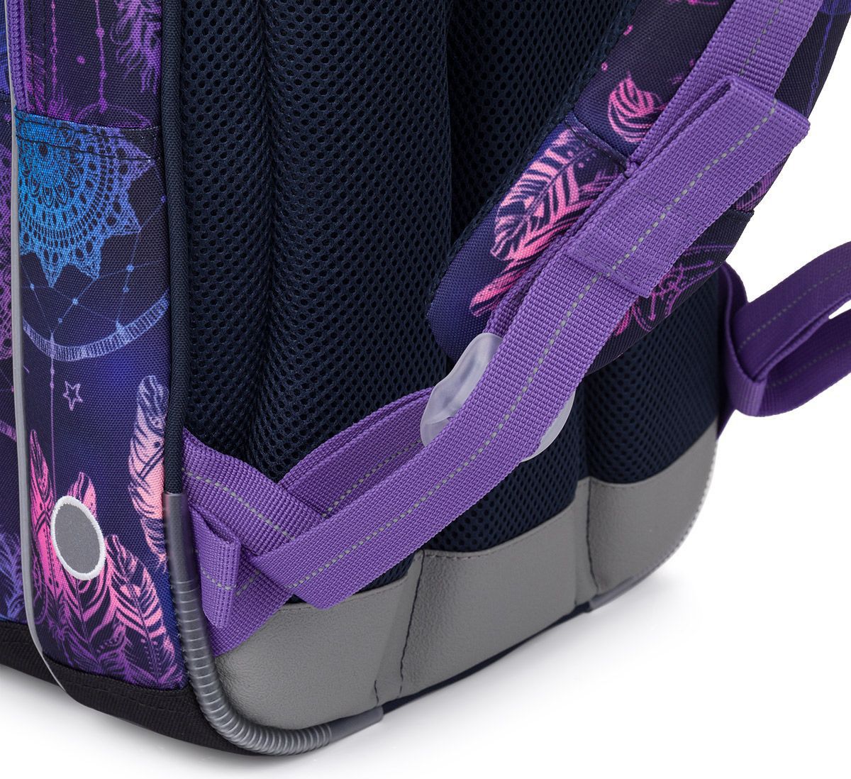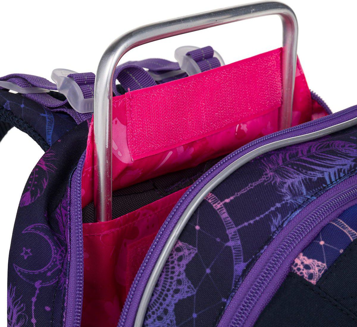 Zadní komora je nejširší, do té doporučujeme dát nejtěžší učebnice nebo desky na sešity. Přední (třetí) komora je ideální pro penál PENN 25006 ve stejném designu nebo krabičku na svačinku. Kromě toho obsahuje síťovou kapsu na drobnosti a karabinu na klíče. Do boční kapsy schováte lahev ZIVA o objemu 0,5 litru.