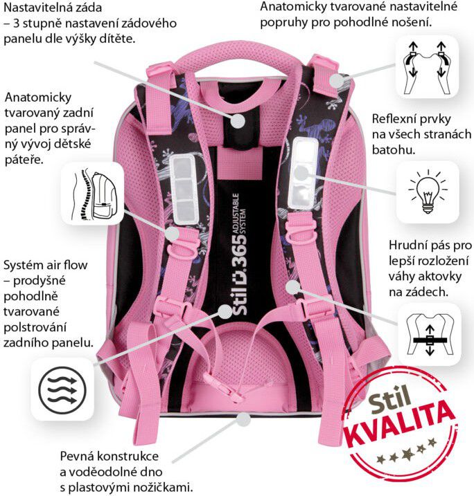 - STIL ADJUSTABLE SYSTÉM – nastavitelný systém zad se třemii stupněmi pro optimální usazení batohu na zádech podle výšky a věku dítěte. Batoh, který roste s dítětem