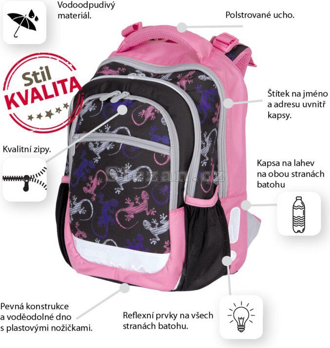 Kvalitní, ergonomicky tvarovaný odlehčený školní batoh je vybaven reflexními prvky a anatomicky tvarovanými zády s pevnou konstrukcí.
