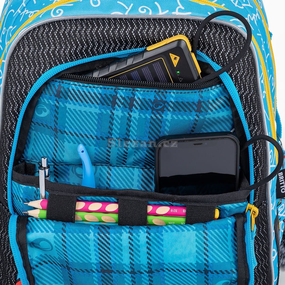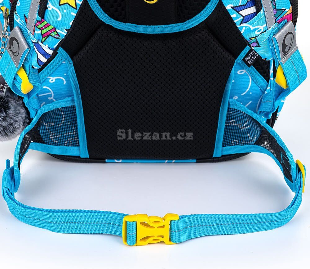 Ramenní popruhy jsou anatomicky tvarované a měkce polstrované. Popruhy je možné individuálně nastavit dle velikosti vašeho školáka, a to pomocí dolních plastových spon umístěných na ramenních popruzích. Součástí batohu je flexibilní hrudní páska k fixaci popruhů na ramenou školáka. Koncovky popruhů s reflexním prvkem a magnetem snadno uchytíte na konce ramenního pásu. Boční poutko pro uchycení navijáku na čip nebo klíče. Díky důmyslnému umístění tak vždy vklouznou přímo do boční kapsy.