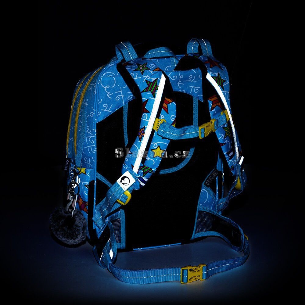 Na školním batohu LUMI je velké množství reflexního materiálu pro maximální zvýšení viditelnosti dítěte v silniční dopravě. Zejména v přední části školního batohu, po stranách, ale i na ramenních popruzích. Nový typ odlehčených taháčku s pryžovým poutkem zajistí pohodlné ovládání zipů.