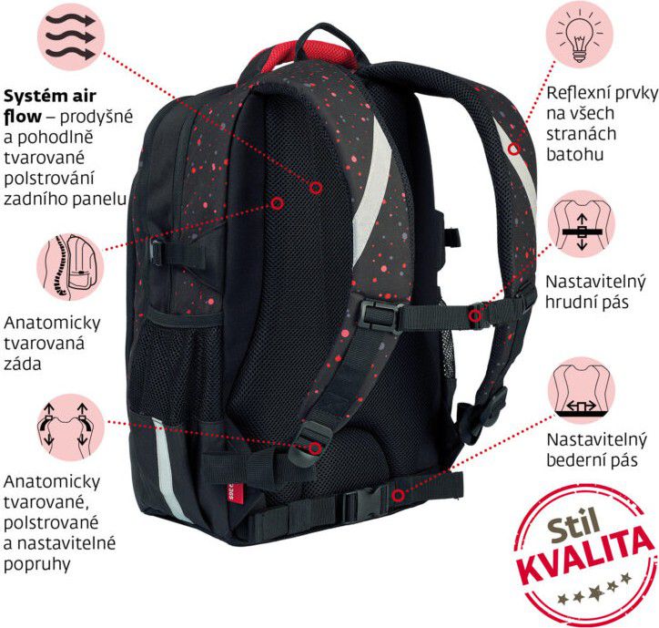 Kvalitní, ergonomicky tvarovaný, odlehčený školní batoh s anatomicky tvarovanými zády.