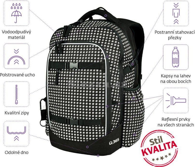 - Popruhy na přední kapse pro uchycení například mikiny na cestu domů ze školy