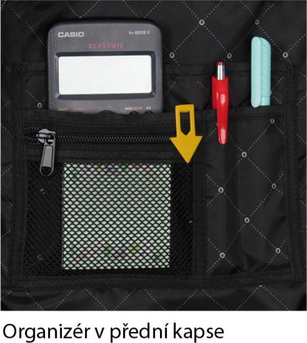 - Skládá se ze 3 komor, hlavní a prostřední komora je vhodná pro formát A4, v přední kapse je organizér na drobné předměty, klíče apod. Kapsa na notebook (do velikosti 15 ) v zadní komoře