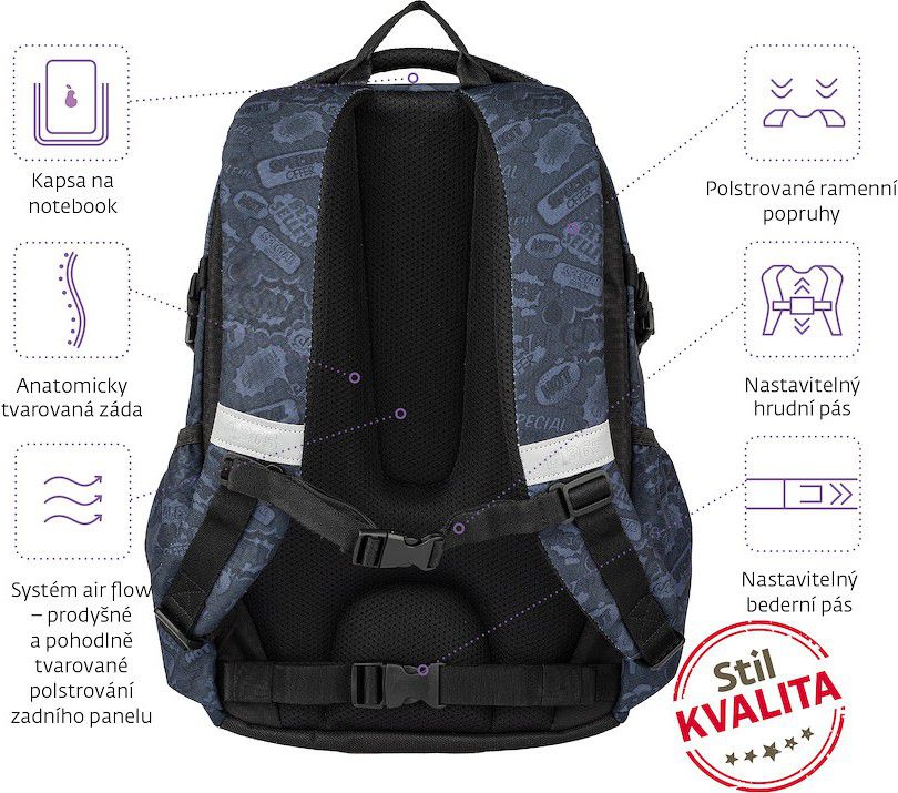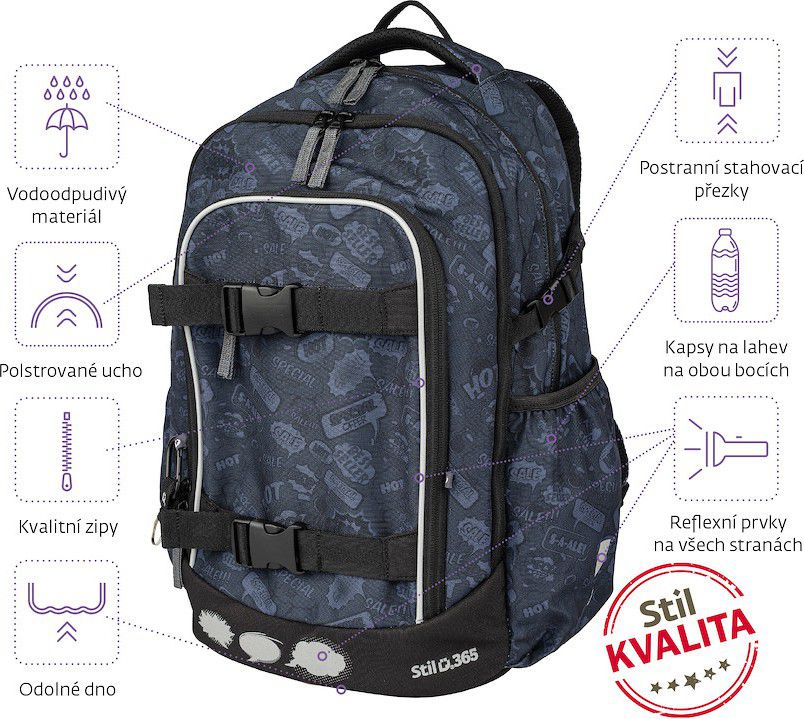 • Popruhy na přední kapse pro uchycení například mikiny na cestu domů ze školy