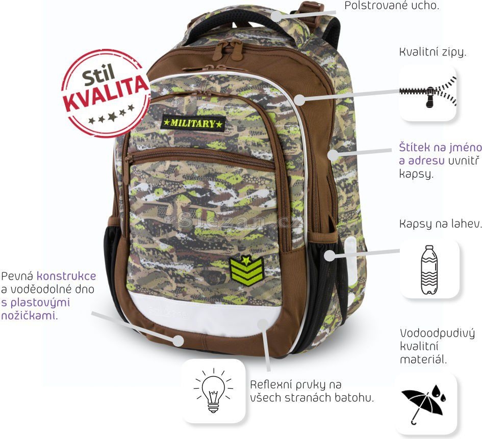 Těžké věci jsou uloženy nejblíž k zádům, což přispívá ke správnému držení těla školáka. Hrudní pás - pro optimální rozložení zátěže na zádech s možností nastavení popruhů dle výšky dítěte. Anatomicky tvarované nastavitelné popruhy pro pohodlné nošení.