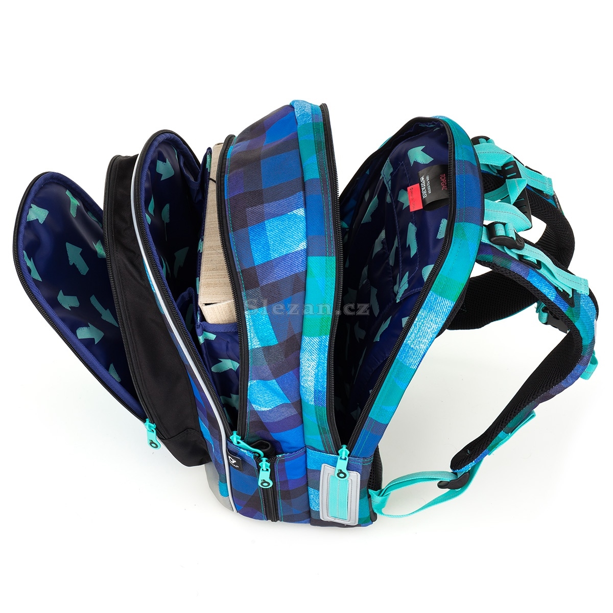 Batoh má dvě objemné hlavní komory. V zadní kapse najdete ještě malou síťovou kapsu na zip. Hlavní vychytávkou širší přední komory je to, že je rozdělena polstrovanou přepážkou na dvě části. Tím pádem od sebe můžete pohodlně oddělit učebnice a sešity, nebo učení a svačinku.