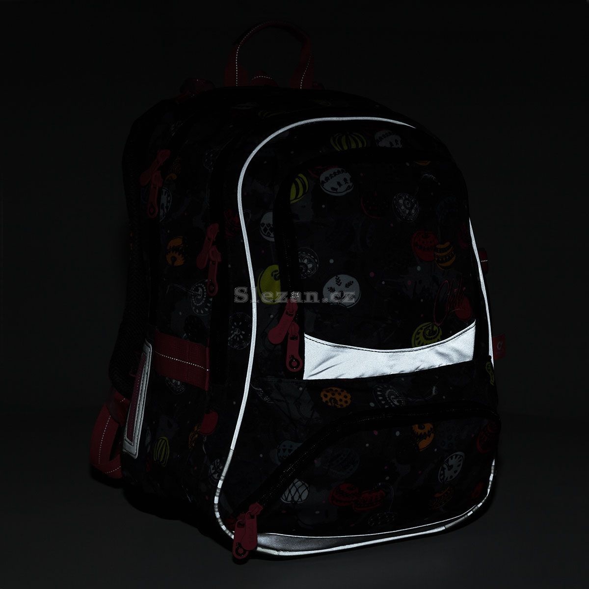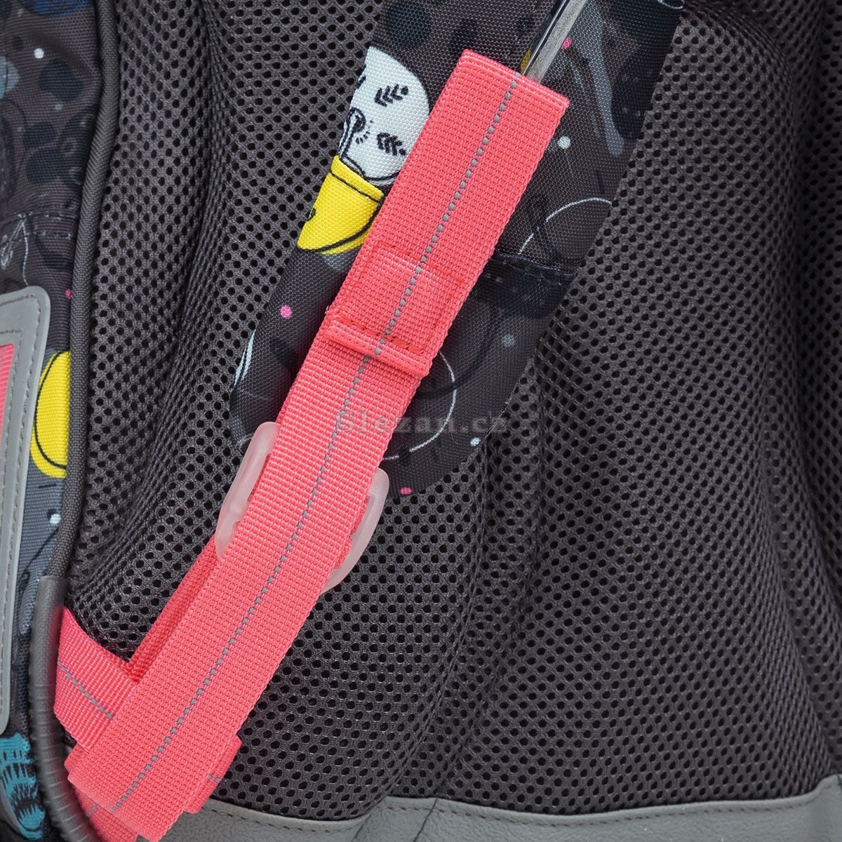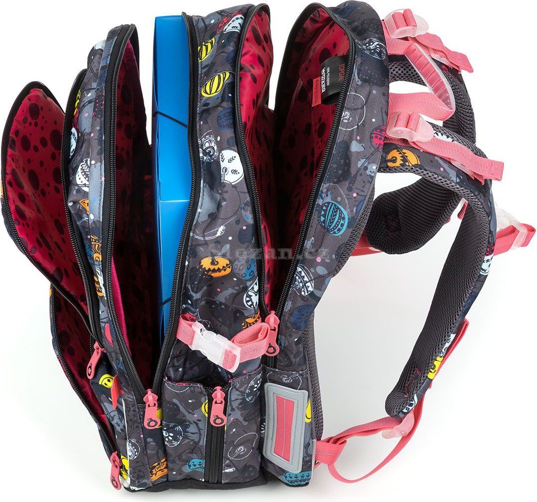 Batoh je objemného střihu, dvě hlavní komory unesou vše, jen radíme to nejtěžší učení dávat vždy nejblíže zádům. V přední širší komoře je malá síťová kapsa na zip a jmenovka. Na čele batohu jsou pak dvě praktické kapsy. Do obou se pohodlně vejde naše krabička na svačinu, nebo penál PENN 19007 ve stejném designu. V horní kapse je navíc karabinka na klíče.