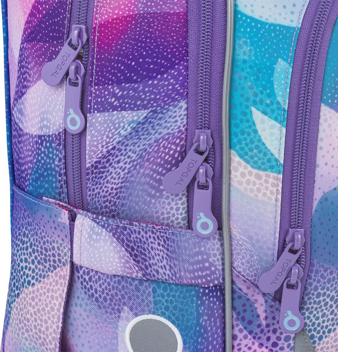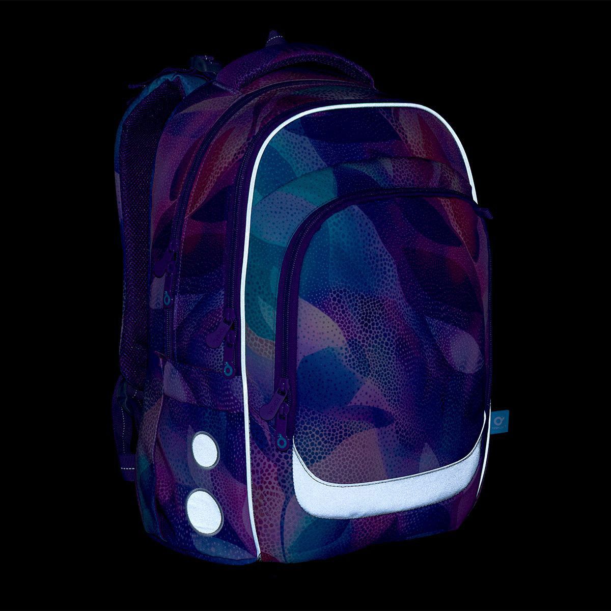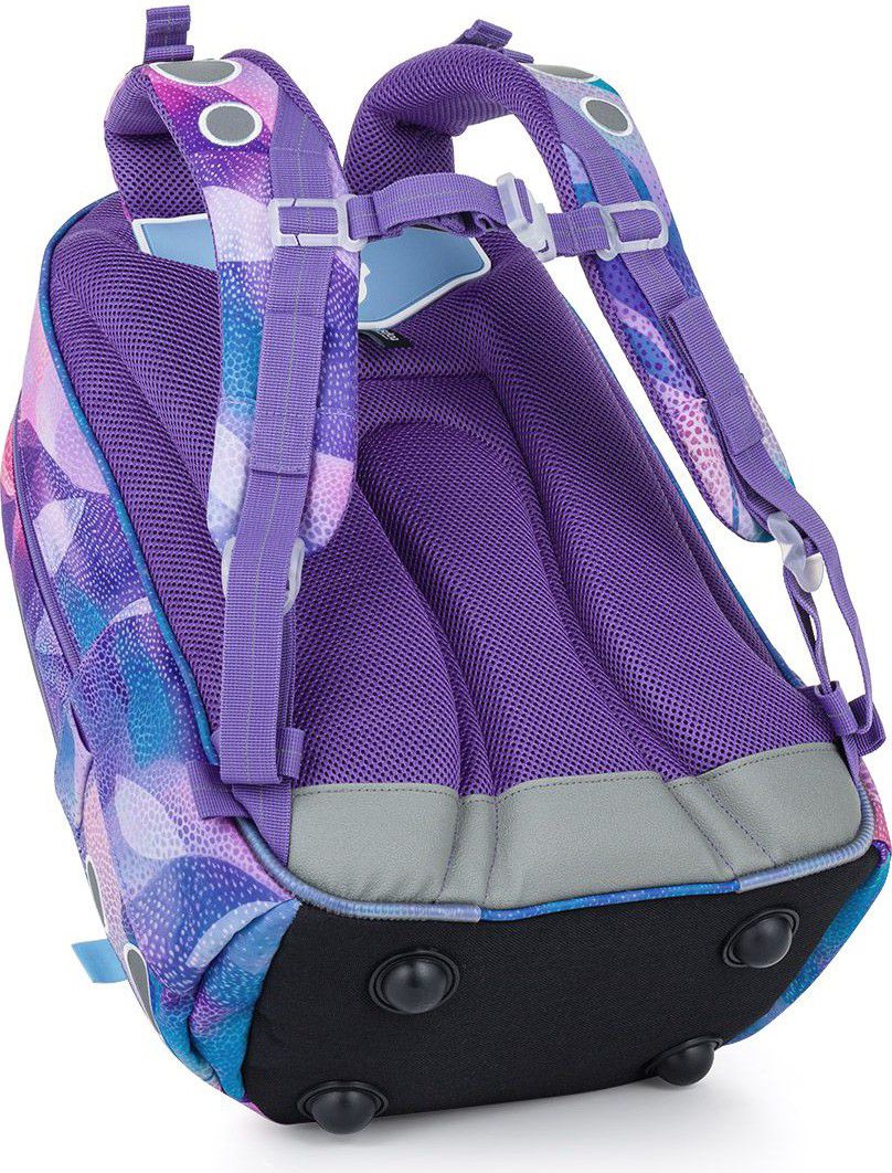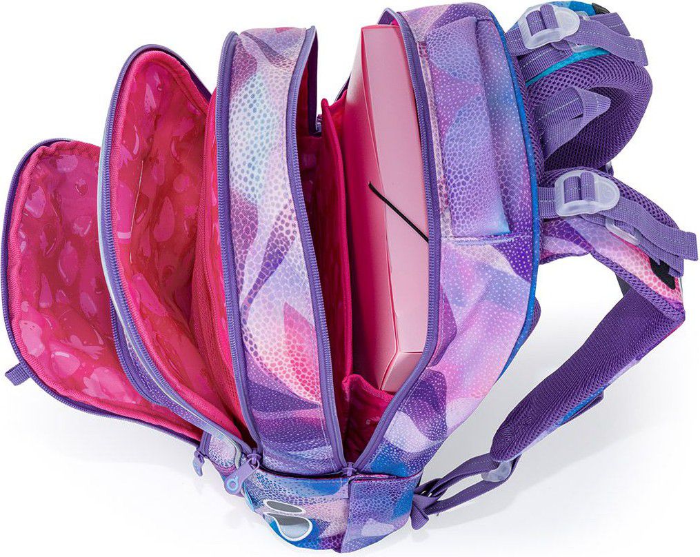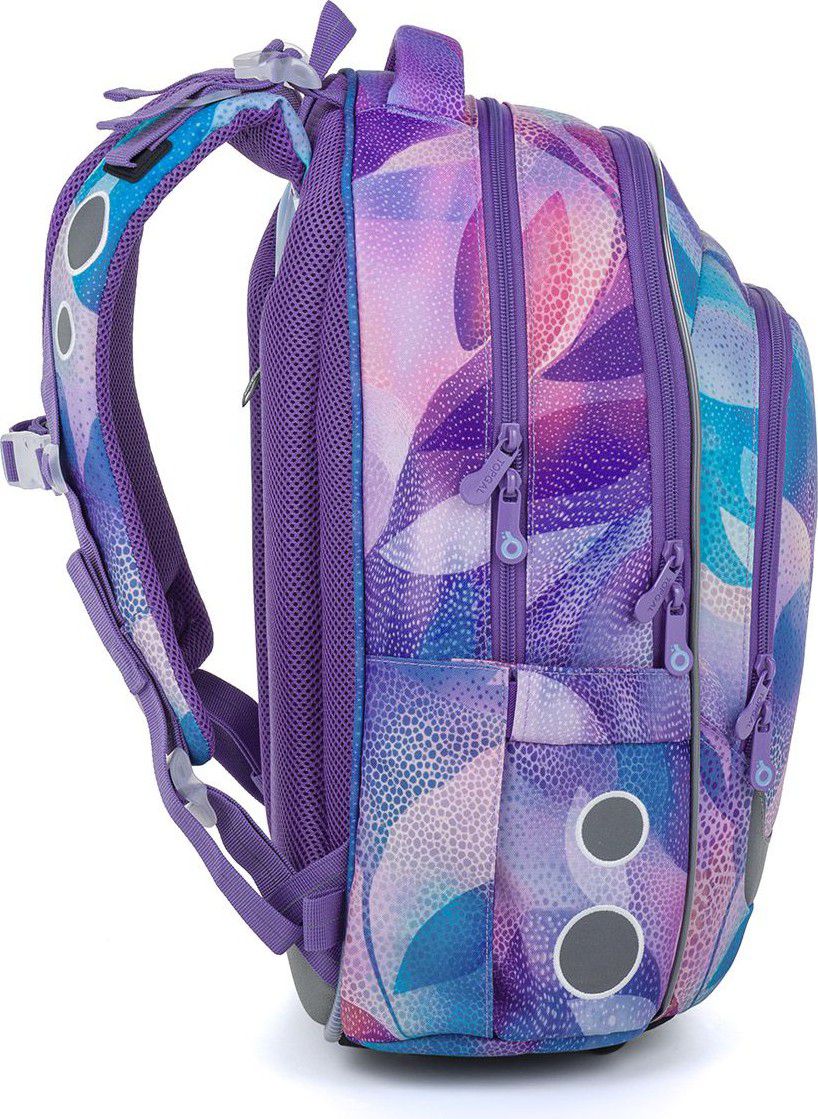 Školní batoh LORI 26009 je navržený pro školačky od 125 cm a díky svému objemu i konstrukci bez problémů vydrží až do 6. třídy. Pastelový abstraktní motiv v odstínech fialové, růžové a tyrkysové působí jemně, ale zároveň originálně – batoh tak skvěle doplní školní i volnočasový styl.