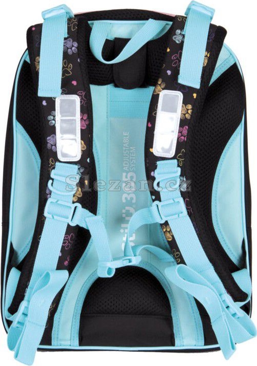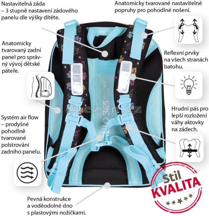 - 3D ZÁDOVÝ SYSTÉM – batoh perfektně sedí na zádech. Anatomický zádový panel se přizpůsobí páteři dítěte a systém Air Flow a prodyšné polstrování umožní cirkulaci vzduchu a příjemné nošení. Hrudní pás s kvalitní přezkou zajistí dobré usazení aktovky na zádech dítěte