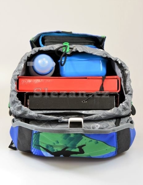 Hlavní komora vhodná na učebnice A4 a školní desky, možnost stáhnutí na šňůrky