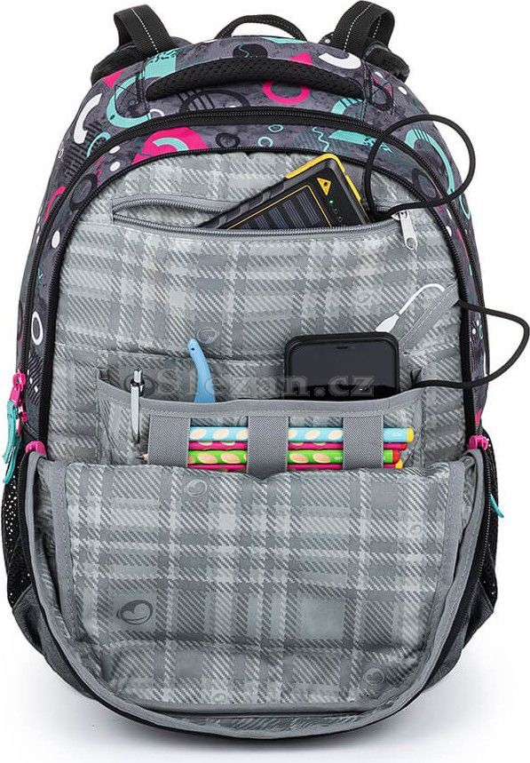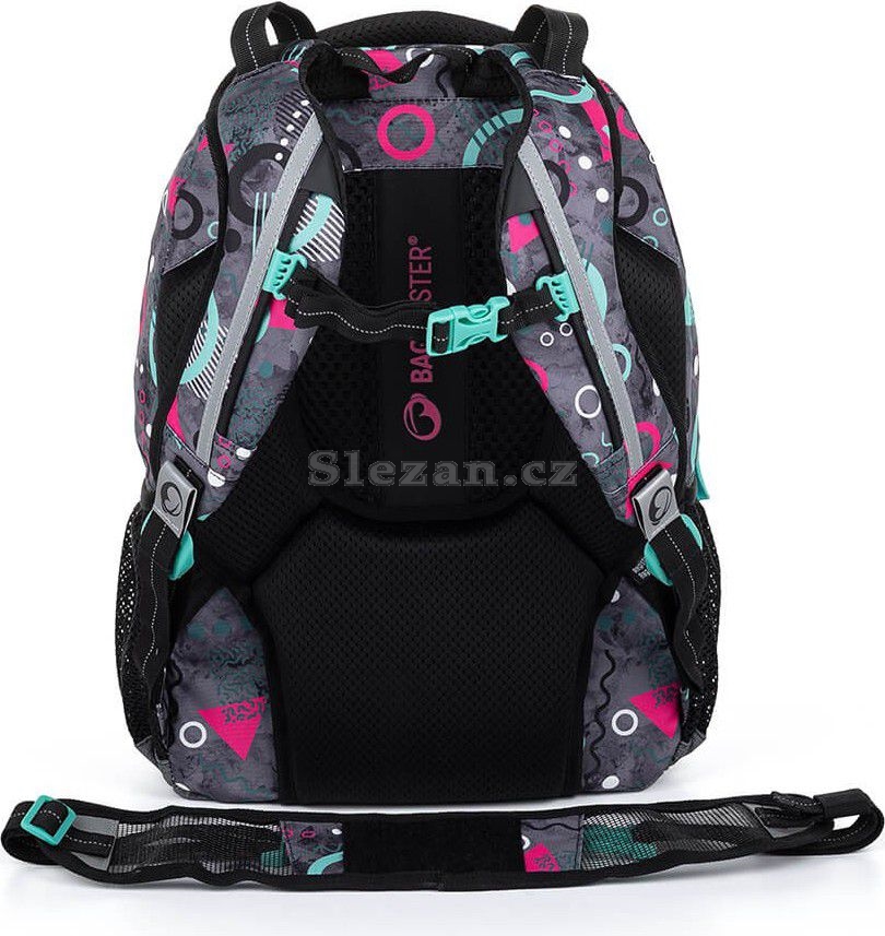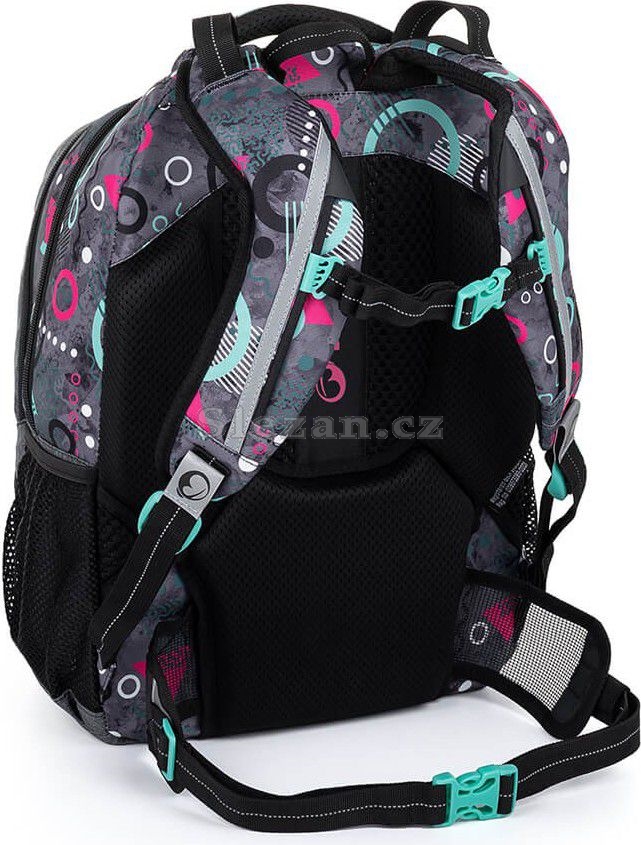 Ramenní popruhy jsou anatomicky tvarované a měkce polstrované. Popruhy je možné individuálně nastavit dle velikosti vašeho školáka, a to pomocí dolních plastových spon umístěných na ramenních popruzích. Součástí batohu je flexibilní hrudní páska k fixaci popruhů na ramenou školáka. Koncovky popruhů s reflexním prvkem a magnetem snadno uchytíte na konce ramenního pásu. Boční poutko pro uchycení navijáku na čip nebo klíče. Díky důmyslnému umístění tak vždy vklouznou přímo do boční kapsy.