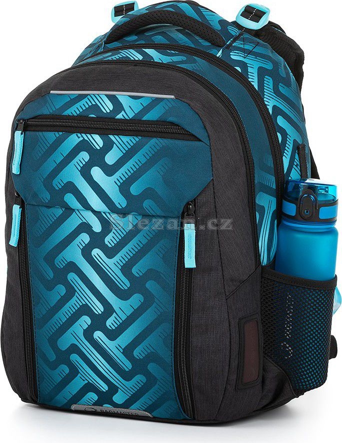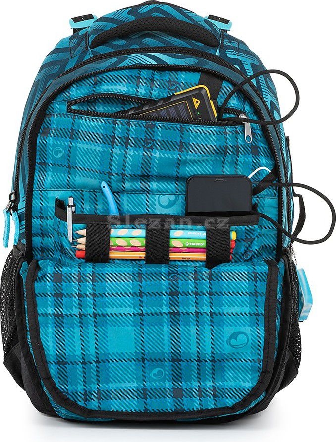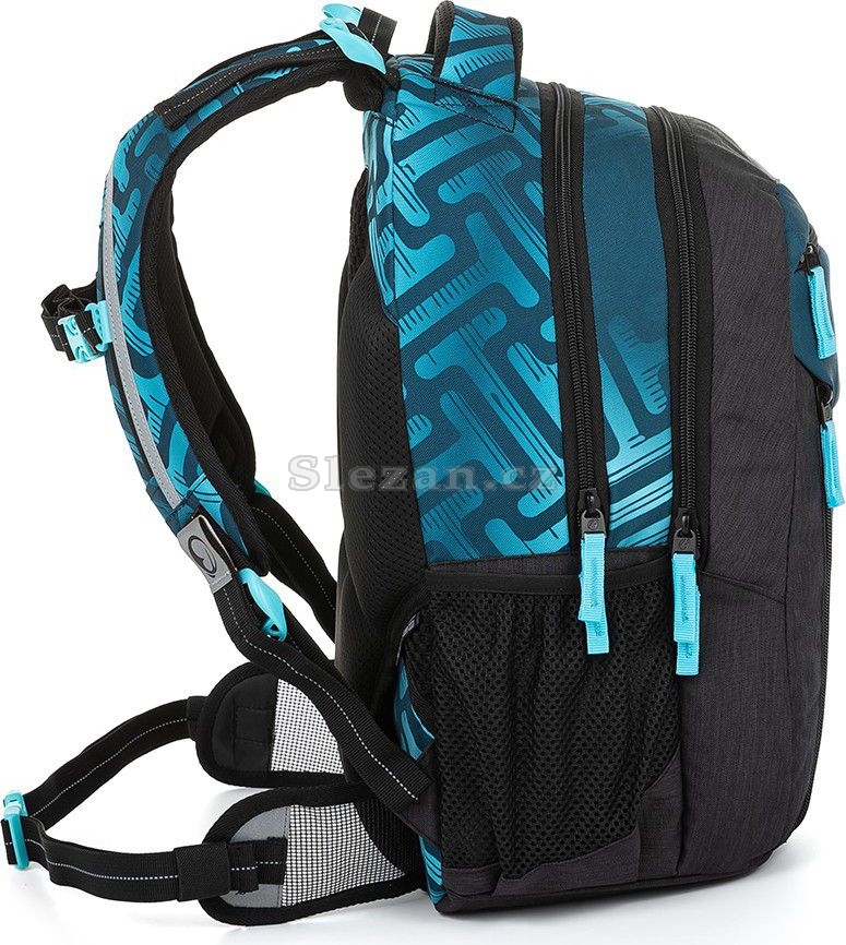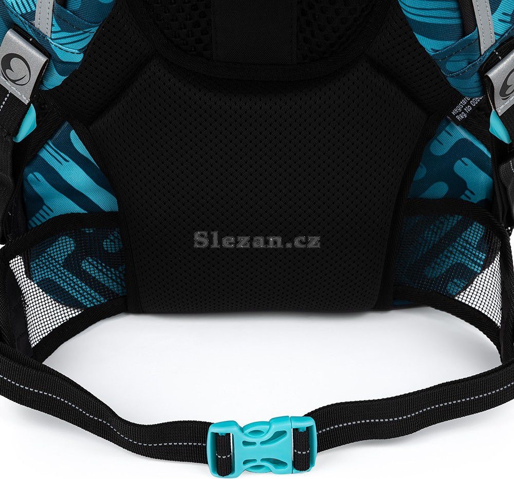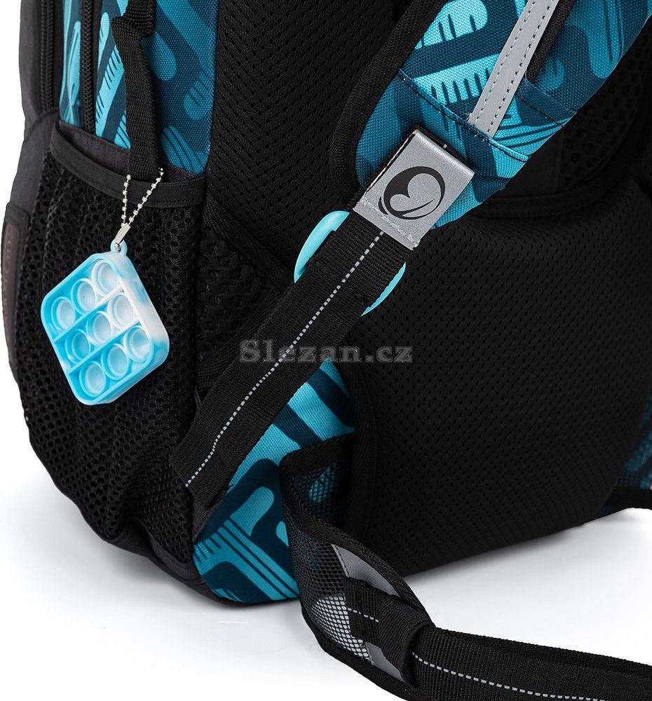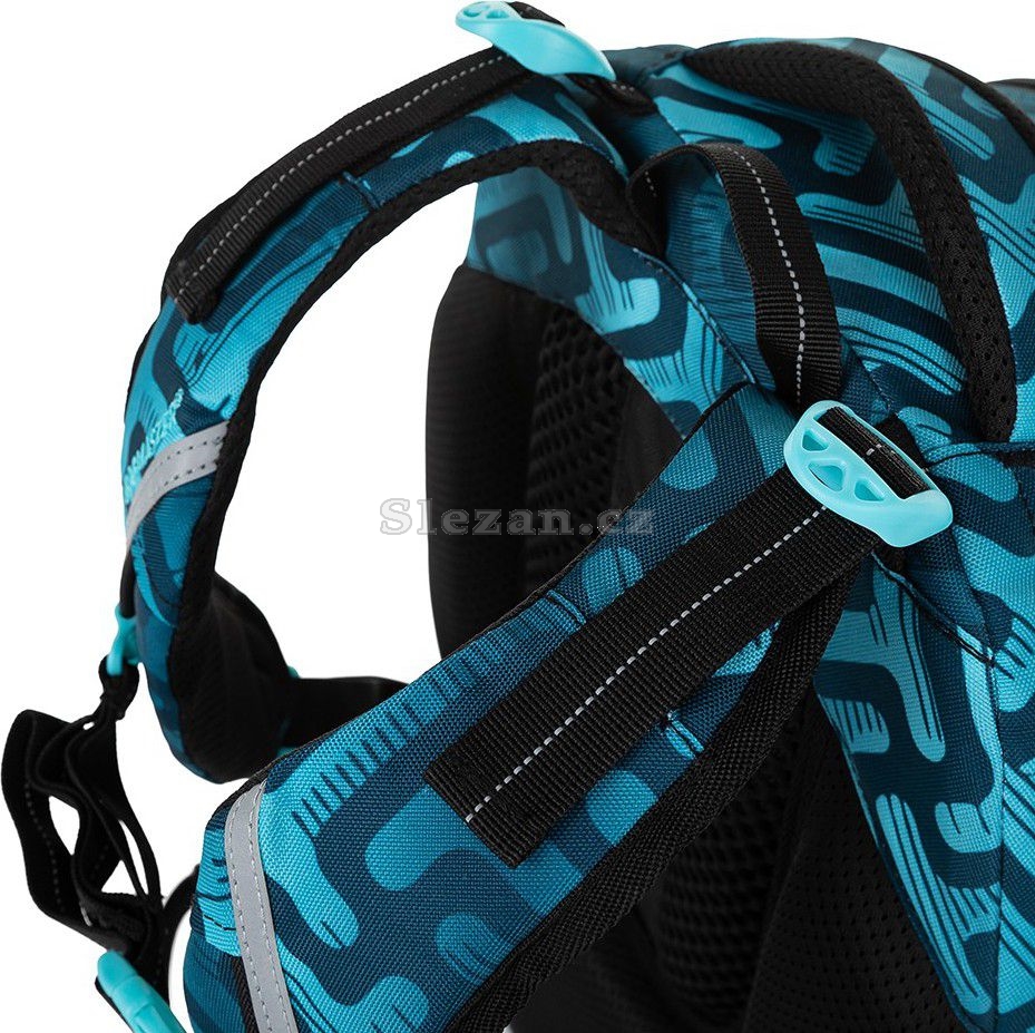 Ramenní popruhy jsou anatomicky tvarované a měkce polstrované. Popruhy je možné individuálně nastavit dle velikosti vašeho školáka, a to pomocí dolních plastových spon umístěných na ramenních popruzích. Součástí batohu je flexibilní hrudní páska k fixaci popruhů na ramenou školáka. Koncovky popruhů s reflexním prvkem a magnetem snadno uchytíte na konce ramenního pásu. Boční poutko pro uchycení navijáku na čip nebo klíče. Díky důmyslnému umístění tak vždy vklouznou přímo do boční kapsy.