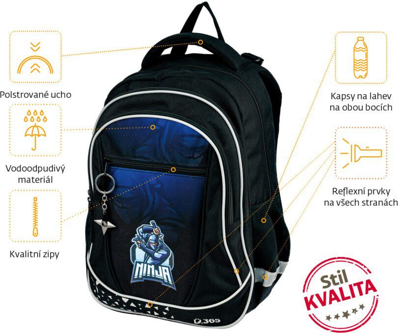 Batoh Prime Ninja je nejen praktický, ale i stylový! Jako ozdobu jsme mu přidali přívěsek ve tvaru šurikenu. Perfektní volba pro všechny, kteří mají rádi trendy detaily!